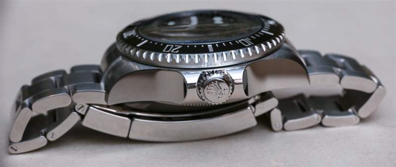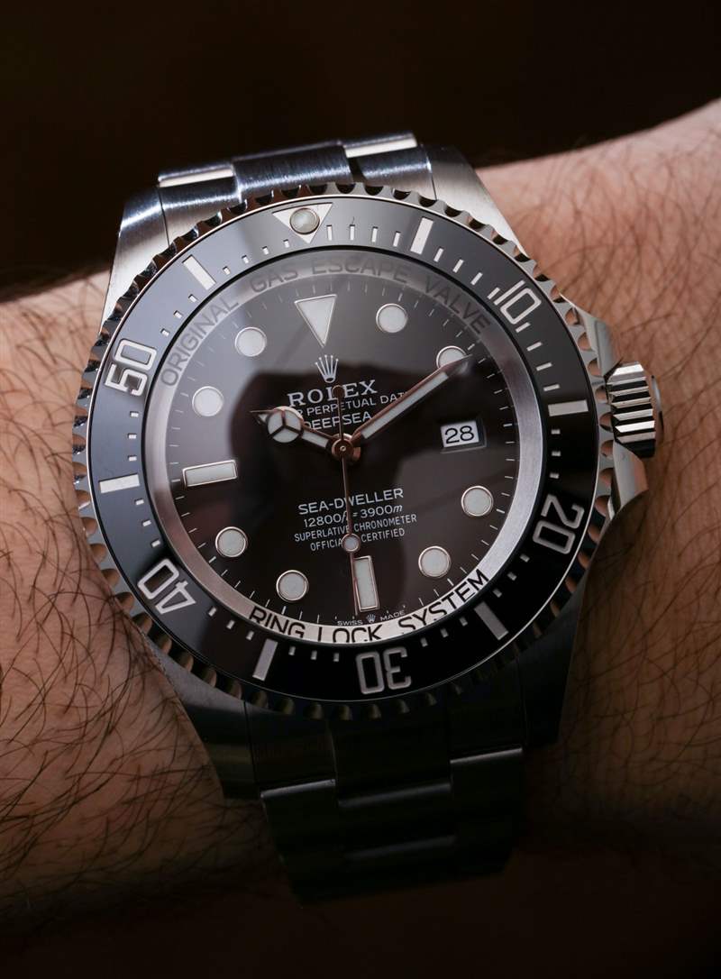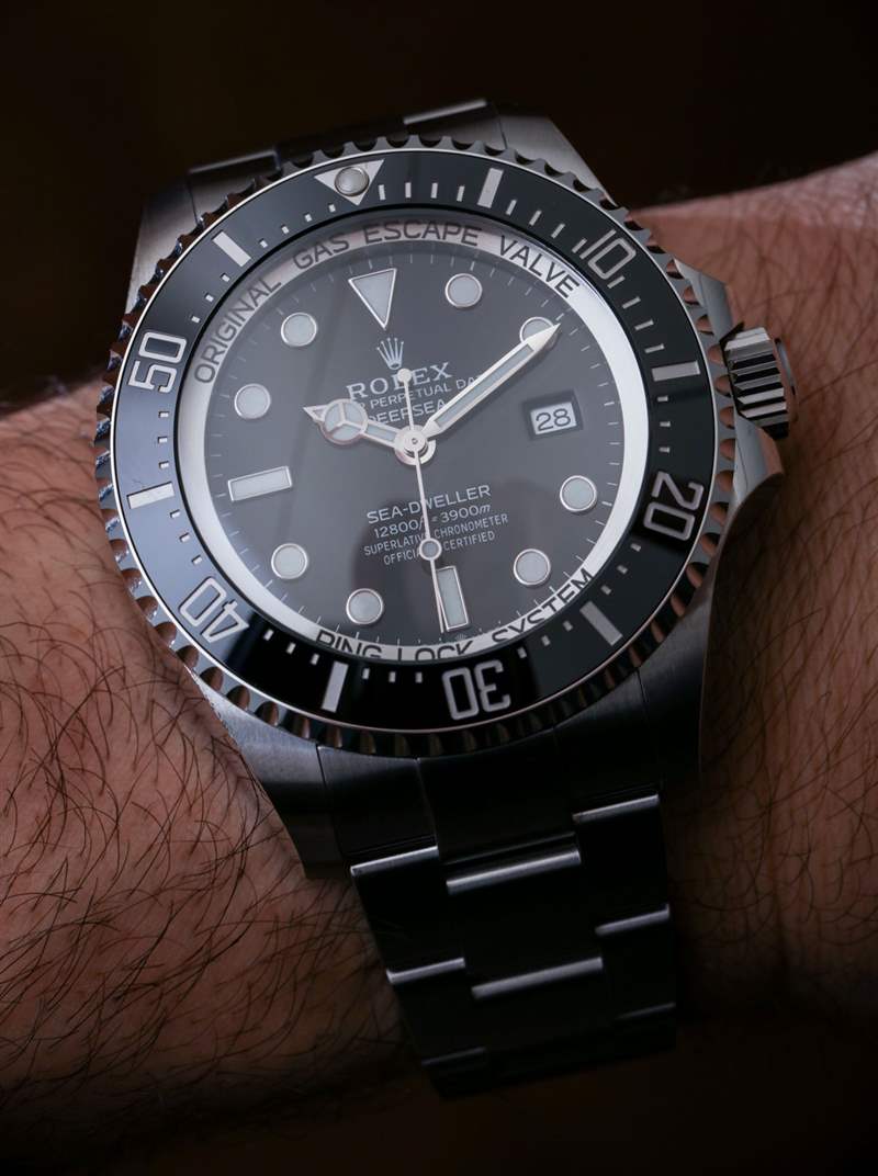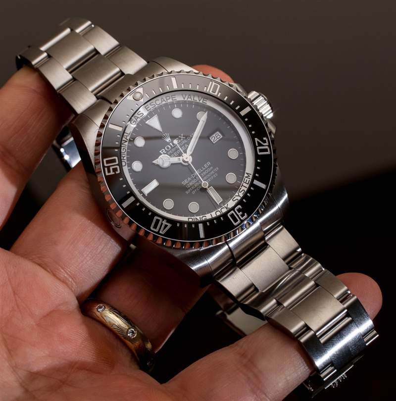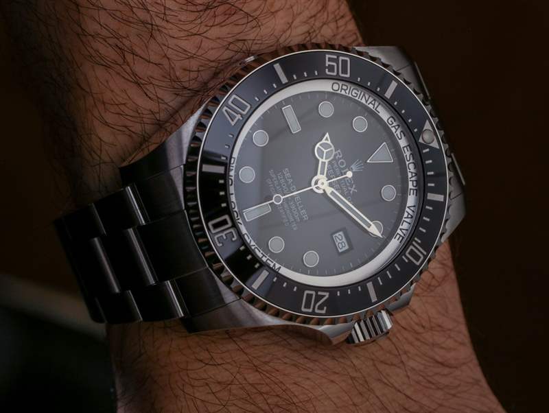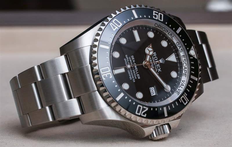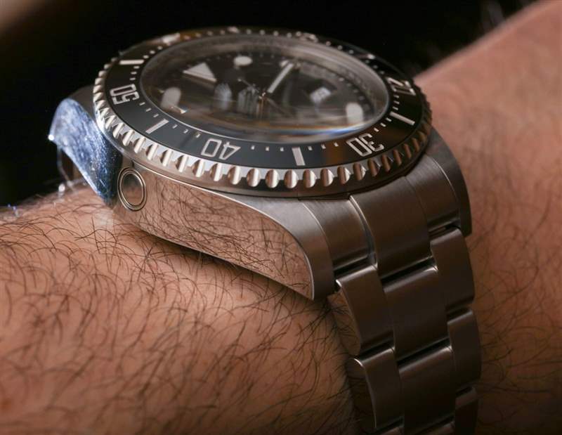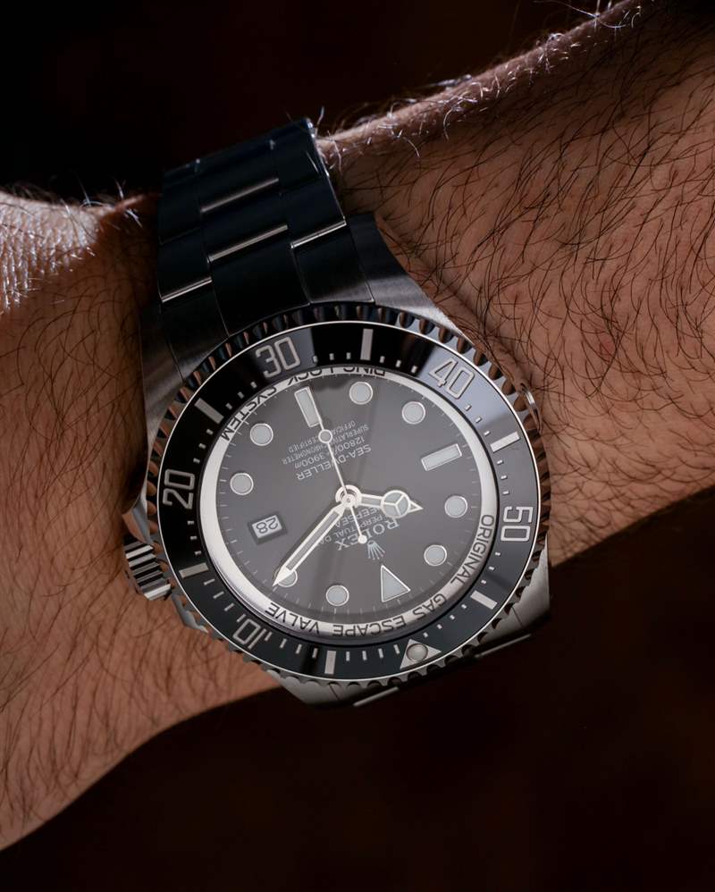 絕大多數(shù)佩戴 Deepsea 的人不會把它帶到水下——更不用說接近 13,000 英尺了。勞力士 Deepsea 的防水深度為 3,900 米,這要?dú)w功于真正的類似潛艇的表殼結(jié)構(gòu)。勞力士制造的手表可以走得更深——但除非你發(fā)現(xiàn)自己參加了一場微型、可穿戴的潛水艇小便比賽,否則這幾乎無關(guān)緊要。人們傾向于佩戴勞力士 Deepsea 的原因(除了它是一臺非常酷的機(jī)器之外)是尺寸。Deepsea 寬 44 毫米,厚度幾乎是 Submariner 的兩倍,是腕間的野獸——但深受粉絲喜愛。