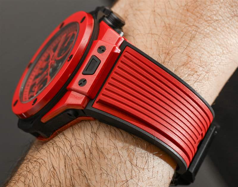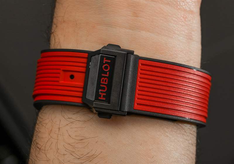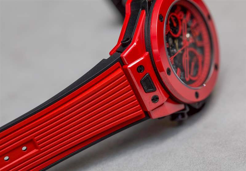 鑒于紅色陶瓷仍然非常新穎,佩戴紅色 Big Bang 手表對我來說是一種全新的體驗——這款手表在這種皮膚上的感覺肯定非常舒適。雖然人們可能會聲稱從遠(yuǎn)處看手表似乎是由塑料制成的,但我認(rèn)為這只是以前這種外觀幾乎完全由塑料制成的結(jié)果。仔細(xì)檢查或戴在手腕上時,表殼材料既不感覺也不便宜。宇舶表將這款 45 毫米寬(15.4 毫米厚,??防水深度達(dá) 100 米)的手表與黑色和紅色橡膠表帶搭配,令外觀更加完美。如果這些顏色對你說話,那么我認(rèn)為這款手表將很難抗拒(當(dāng)然預(yù)算愿意)。