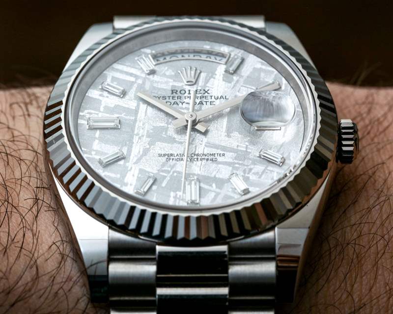 我發現隕石表盤是勞力士 Day-Date 40 主題的美麗而引人注目的補充。勞力士只使用最優質的材料,尤其是其高端系列,因此您會得到一塊既清晰又實用的絕妙天然材料。這款腕表的一大魅力在于將稀有材料積聚在一個產品中,因為它結合了 18ct 白金、鉆石和隕石,所有這些都被認為是珍貴的材料。雖然這些材料的實際市場稀缺性存在爭議,但將這些材料整合在一起的目的之一是提高手表的內在價值。