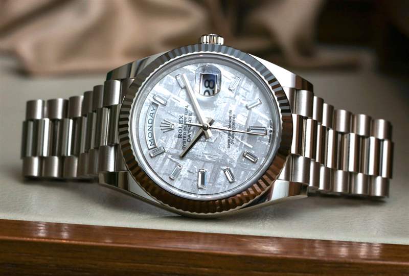 白金是一種非常奢華的材料,但它通常看起來并不比鋼多。白金的重量增加意味著它的佩戴方式與鋼不同,但除非你碰巧身邊有一位知道 Day-Date 40 只有黃金和鉑金的手表愛好者,否則這款手表很容易被誤認為是不銹鋼。引人注目的隕石表盤上鑲有鉆石,這款特別的勞力士總裁腕表在奢華與精致之間劃清了界限,進一步增添了它的個性和個性。
