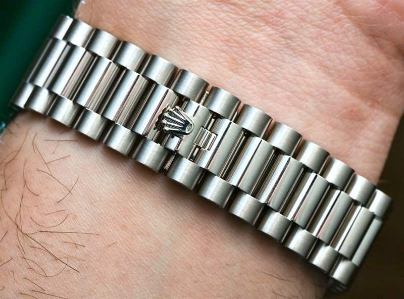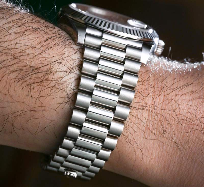 Day-Date 40 ref 寬 40 毫米,不是特別厚。228239 穿得很好看。手表在視覺上比實際要小的原因之一是表鏈的寬度似乎縮小了表殼的尺寸,這符合勞力士強調總統表鏈的愿望。這款圓形三鏈式手鏈戴在手腕上非常舒適,得益于“隱藏”的展開式表扣,從頭到尾看起來都一樣。