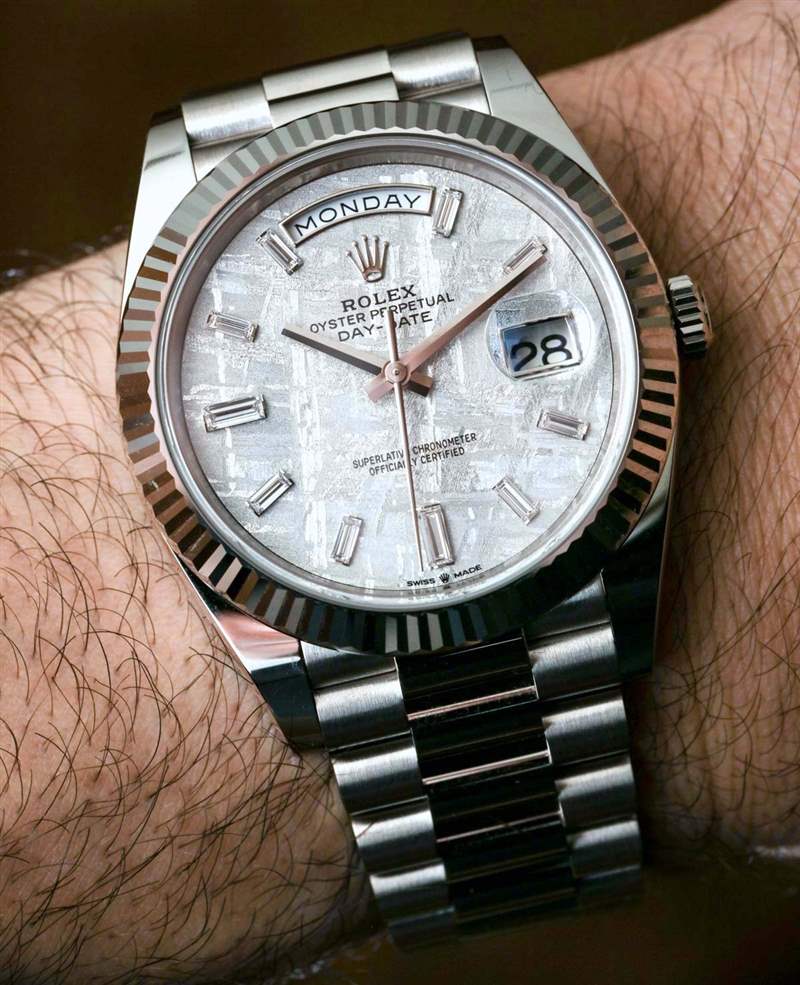 勞力士將這款隕石表盤與長方形切割鉆石時標配對,使其成為一款奢華而優雅的時計。添加裝飾元素,如鉆石,很難保持手表的陽剛氣質,但鉆石時標的微妙之處使其發揮作用。當然,表盤在 12 點鐘位置設有星期窗口,在 3 點鐘位置設有日期窗口。事實上,當勞力士 Day-Date 腕表最初于 1956 年問世時,它是第一款配備同時顯示日期和星期幾的表盤的腕表。廣告訊息廣告信息結束