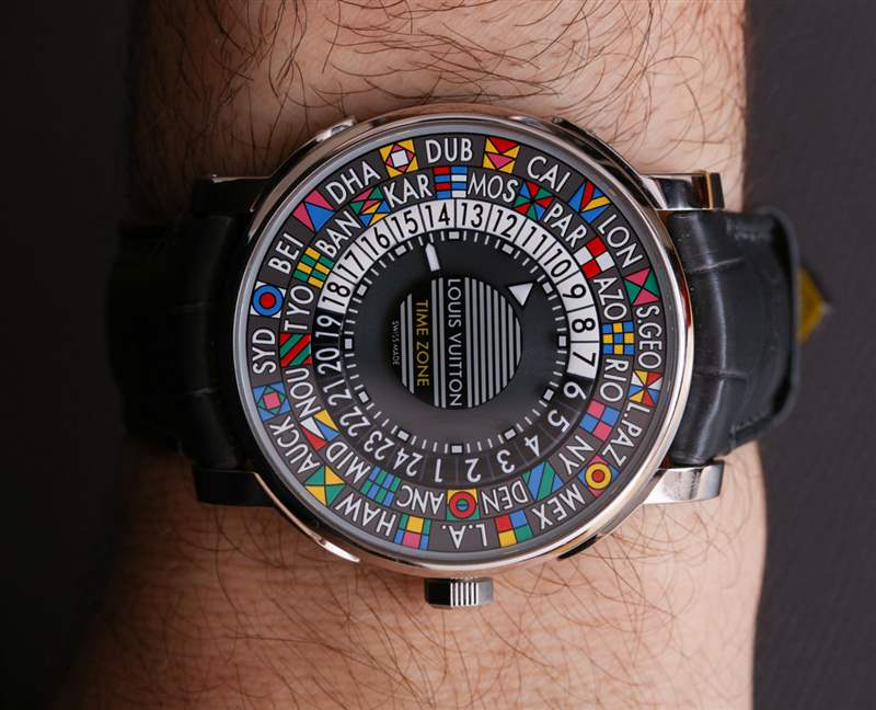 先介紹一些歷史和背景。路易威登的許多手表都受到他們昨天的行李箱和行李箱系列的啟發。這些是手工制作的產品,幫助這家法國奢侈品牌登上了地圖。產品中這種影響的一個例子是凸耳。這些凸耳分別連接在表殼的側面,旨在模仿該品牌歷史悠久的行李物品上金屬硬件的外觀。對路易威登行李箱世界的另一個致敬是五顏六色的“旗幟”,它們位于世界時間盤上參考城市名稱的上方或下方。我不是路易威登復古行李箱的專家,但我的理解是,這些小旗幟可以在一個人旅行到一個城市后涂在行李箱上(并且似乎受到海上旗幟世界的啟發)。