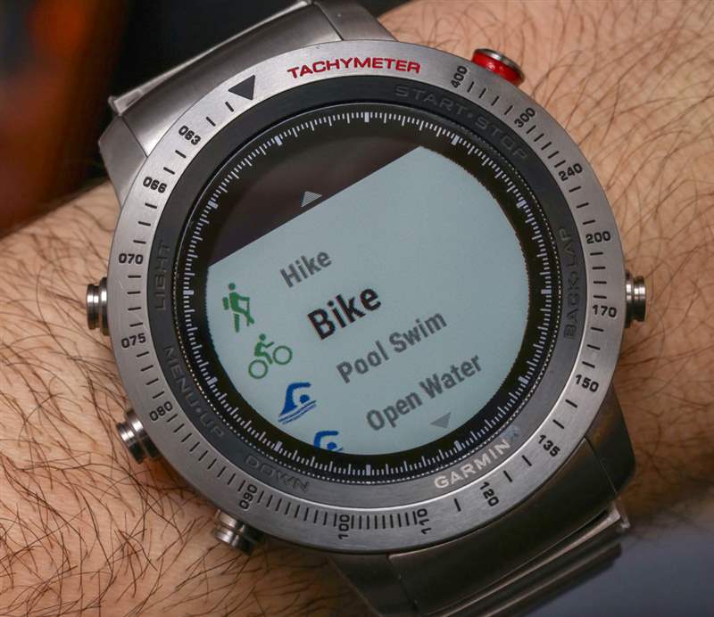 最初設置 Fenix 軟件時,您可以選擇從您個人參與的體育活動列表中進行選擇。該列表可通過用于控制設備的五個按鈕中最突出的按鈕訪問。這個簡短的清單非常有用,因為我可以選擇我經常做的事情,例如騎自行車和徒步旅行,這減少了您在鍛煉之前對一長串選項進行分類的需要。這是我非常欣賞 Fenix Chronos 操作系統的許多可定制的人體工程學細節之一。