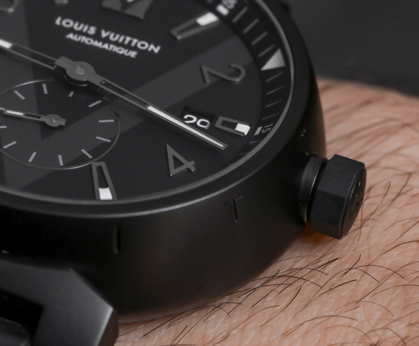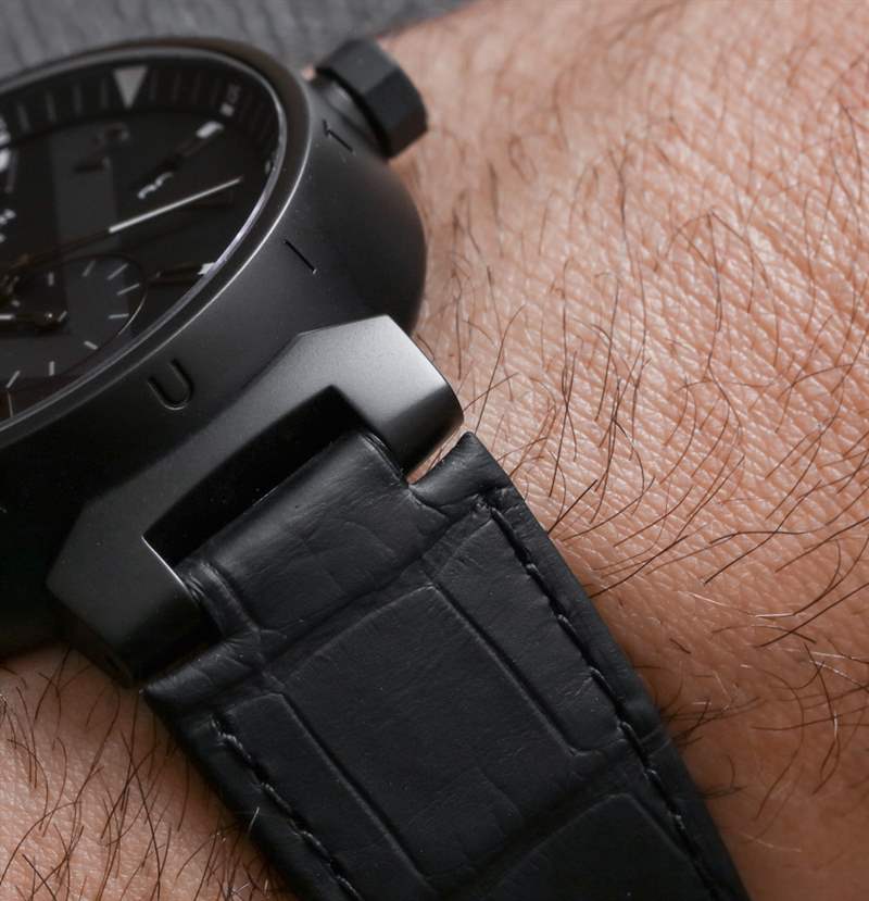如果您想要更大的表殼佩戴體驗,Tambour All Black Chronographe 采用 46 毫米寬的表殼(確實感覺更大)。對我來說,Tambour 的理想表殼尺寸仍然是 44 毫米寬。All Black 精鋼表殼的啞光黑色飾面做得很好,并使用 PVD ??應(yīng)用工藝進(jìn)行應(yīng)用。表帶扣是 DLC 涂層的黑色,這可能是一件好事,因為它提供了更多的耐磨性,而帶扣往往會導(dǎo)致鐘表的大部分磨損。
