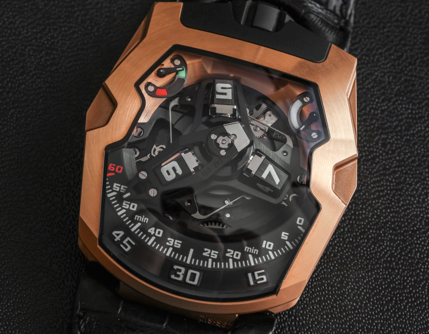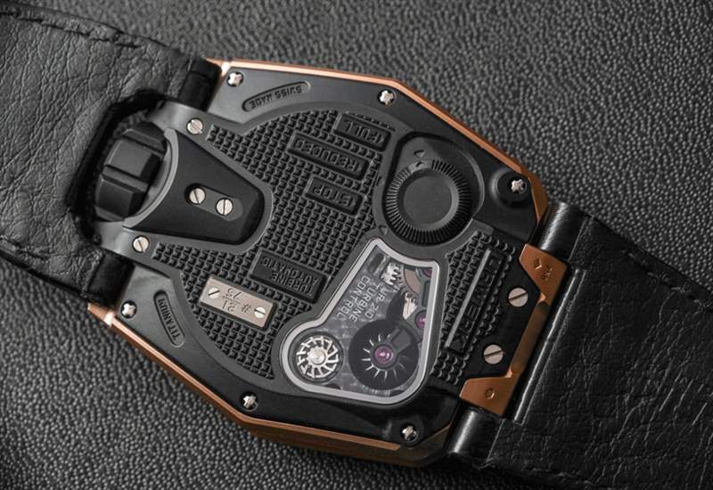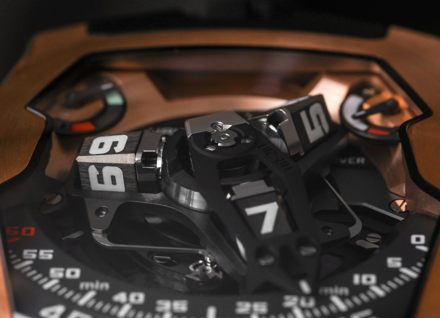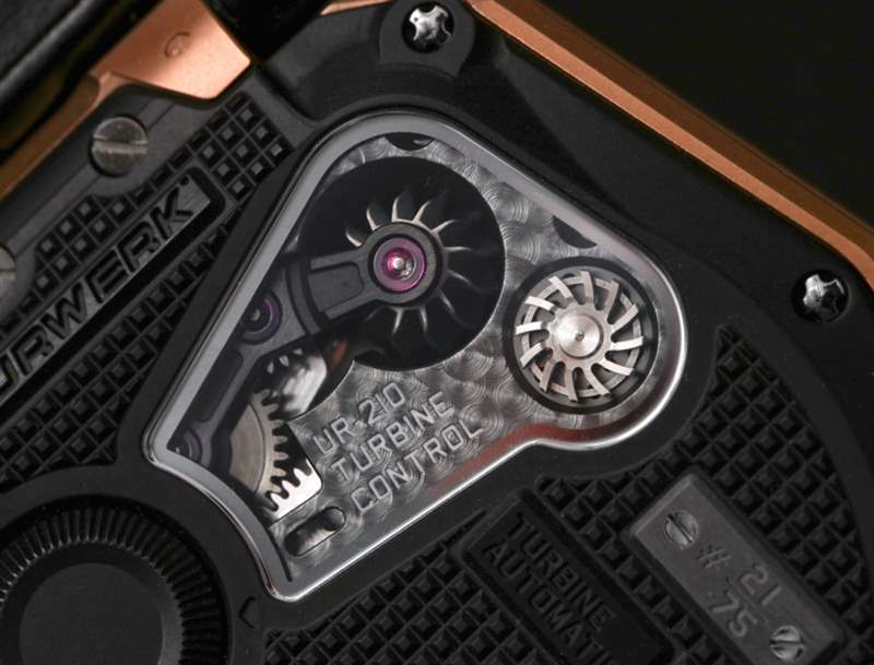 后一項功能并非 UR-210 獨有,但并非在所有 Urwerk 時計中都有。它是內(nèi)部制造的 UR-7.10 機芯的“渦輪控制”系統(tǒng)的一部分,具有三種設(shè)置。Urwerk 將此系統(tǒng)稱為“上鏈效率選擇器”,其目的是讓自動轉(zhuǎn)子(不可見)由于摩擦增加而旋轉(zhuǎn)得更慢,或者完全阻止自動轉(zhuǎn)子上鏈——從而消除了手表自動上弦的能力。