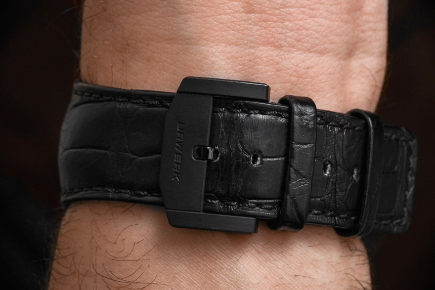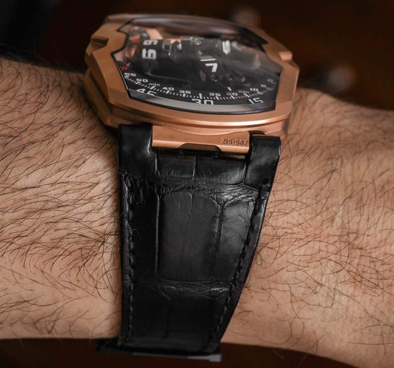 Urwerk 為我的小手腕提供了一條較短的表帶——我很感激。鑒于這條非常好看的黑色鱷魚皮表帶各個部分的厚度,我鼓勵任何對這款手表感興趣的人仔細檢查以確保隨附的表帶適合他們的手腕。如果不是這樣,佩戴體驗可能不會那么舒適。我之所以提到舒適性,是因為我認為每次表殼形狀不是帶有傳統(tǒng)表耳的標準圓形時,都值得一提。在這里,表耳位于表殼底部,位于主表殼下方,從人體工程學的角度來看,這有助于使手表保持正面。廣告訊息廣告信息結(jié)束