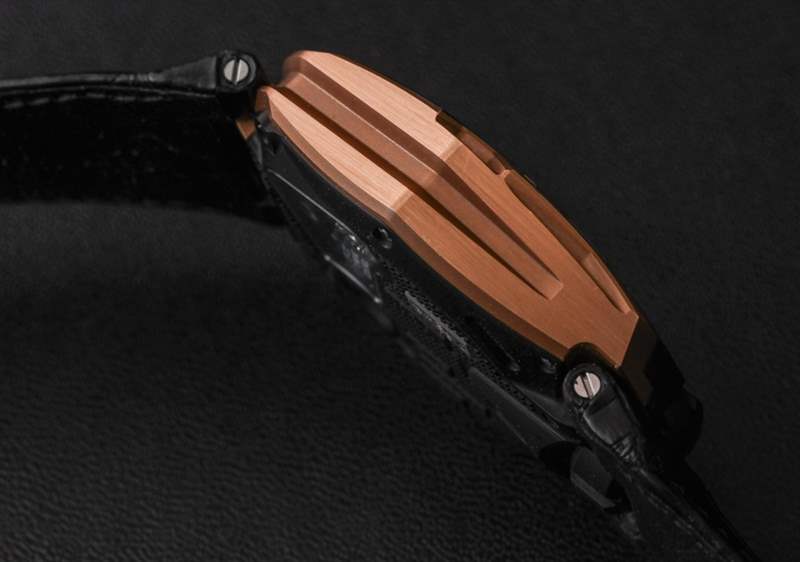 表殼的細節(jié)很好,混合了角度和線條,從大多數(shù)角度來看都很有趣。表殼的大部分是拉絲 18k 紅金,而啞光黑色鈦金屬片則用于表背和表冠組件。表冠本身位于表殼的 12 點鐘位置,值得慶幸的是,它很大并且在手表仍在佩戴時易于上鏈。雖然作為自動手表,您并不需要一直為它上弦。