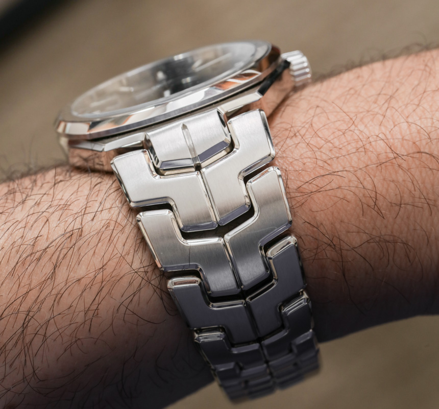 總體而言,我贊賞豪雅表使用 Link Calibre 5 的表盤繼續完成任務的能力。它具有運動感、清晰易讀、引人注目,并且在其他方??面盡可能地克制。表殼寬 41 毫米,防水深度 100 米(不是旋入式表冠)是鋼制的,與上一代 Link 型號有很大不同。表殼實際上是三種不同的形狀,都以某種方式卷成一體。Link 表殼呈圓形、酒桶形和墊形。那是怎么發生的?這是因為表盤是圓形的,表圈是枕形的,表殼本身是酒桶形的,寬大的表耳直接融入表鏈。我確信 Link 出現在手腕上的方式與以前的非常不同,這會讓一些粉絲一開始有點冷漠。對那些人,我會敦促耐心,讓新設計在他們身上成長。這可能是 TAG Heuer Link 的新個性,但它是一種受歡迎的個性,具有更活潑的聲音和使命感。