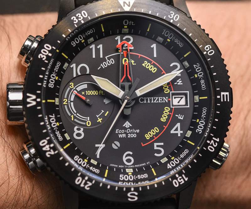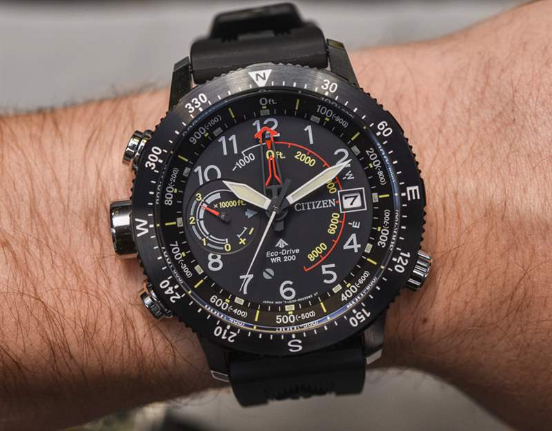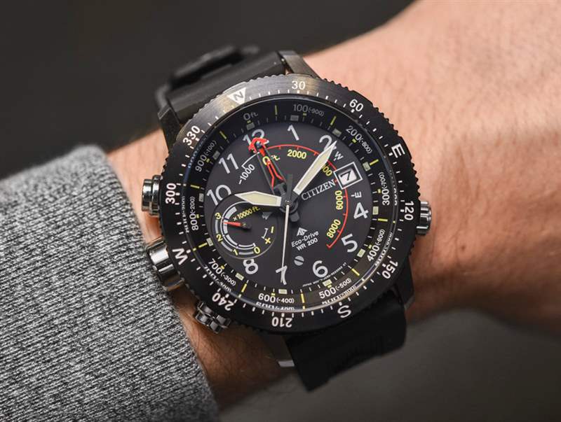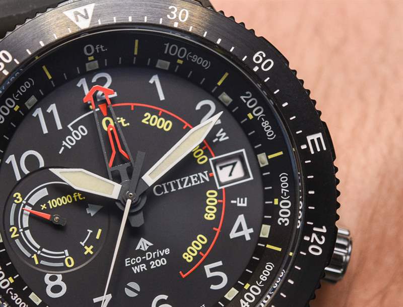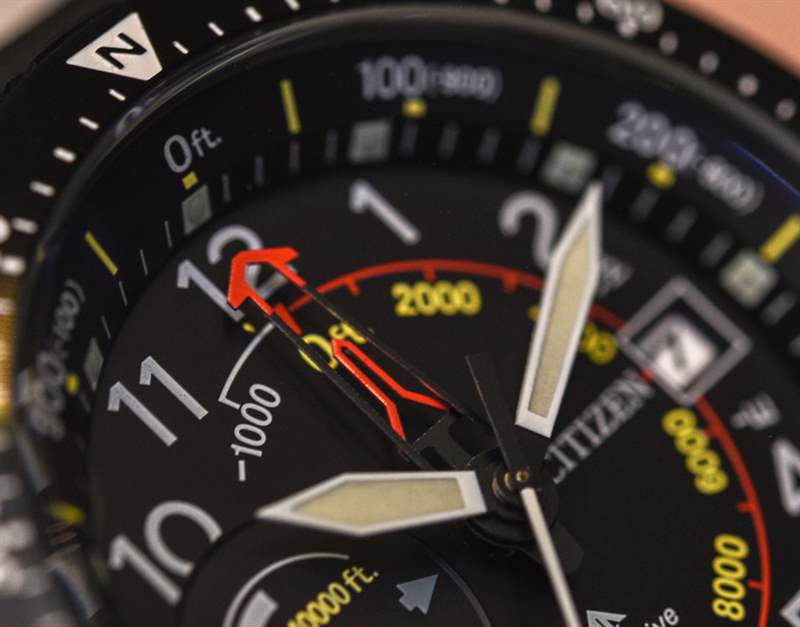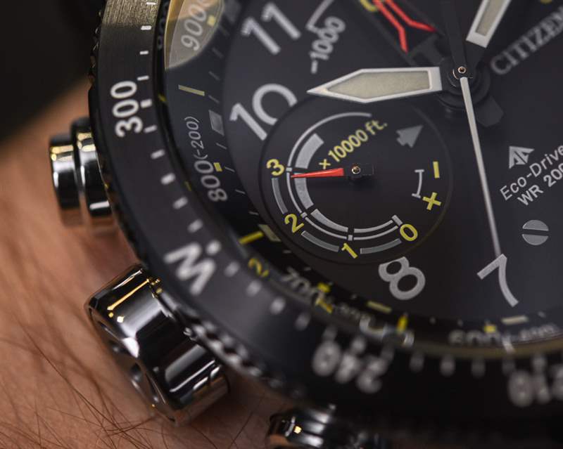 話雖如此,表盤的絕對深度并沒有讓 Altichron 感覺像其他任何東西。表盤需要這么深,因為中心柄需要容納五只手,再加上表盤上的第六只手,用于多功能輔助表盤。您還可以得到日期。據我了解,這款更新的 Promaster Altichron 的機芯沒有變化,它繼續包含 Citizen caliber 3290 Eco-Drive 石英機芯。除了時間、指南針、高度計(可以測量高達 32,000 英尺的非常大的部分)和日歷外,表盤還有一個用于電池壽命的動力儲存指示器。