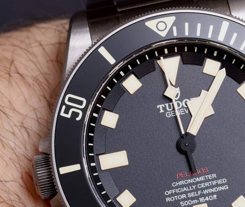 Pelagos 的表盤確實是您可以將其與勞力士 Submariner 區別開來的地方。Pelagos 表盤非常實用、清晰易讀,而且設計出色,可作為潛水表使用。使用 Pelagos 的人越多,我相信人們就越會欣賞表盤在各種照明和閱讀環境中的實用性。平坦的 AR 涂層藍寶石水晶鏡面即使在極端角度也能提供出色的易讀性,整體表盤材料和比例是一款非常好的工具。