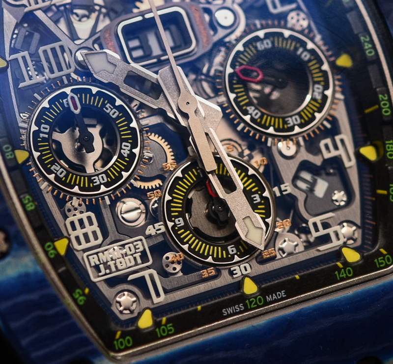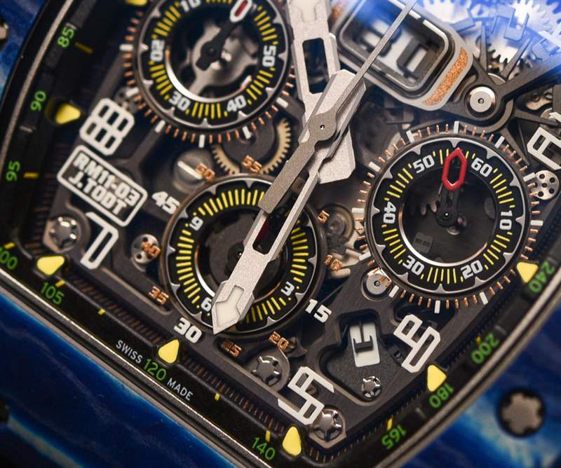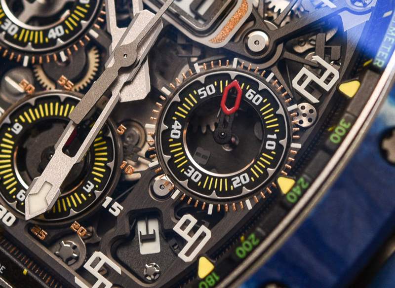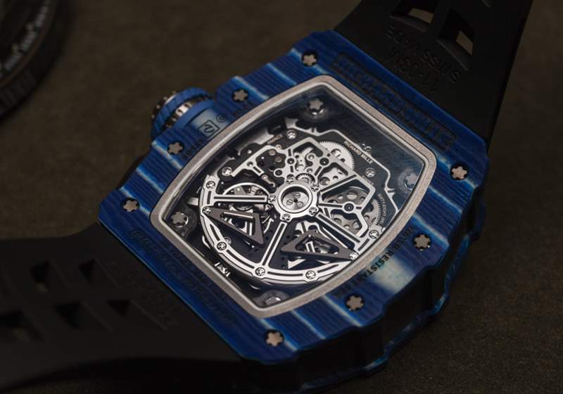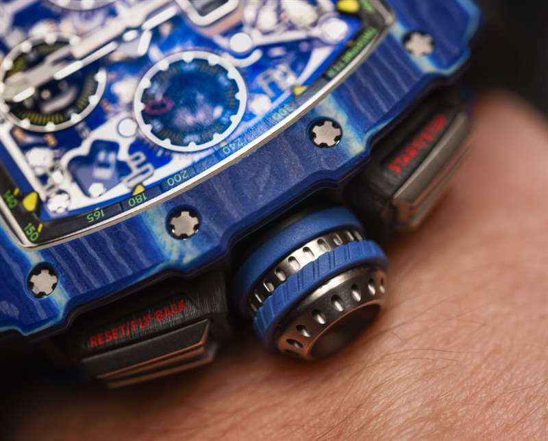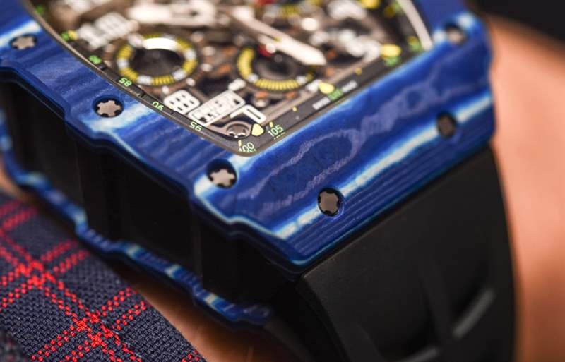 對于 Richard Mille 來說,這是一個嘗試顏色并進一步開發傳奇 RM 11 手表系列的絕佳機會,這有助于使該品牌在地圖上名聲大噪。在其先進的形式中,RM 11 具有相同的有用機芯,但采用石英 TPT 制成的奇特表殼,這是一種在瑞士生產并從高性能車輛借來的材料。這種材料是由數百片二氧化硅組成的致密層,每層只有幾微米厚。藍色只是裝飾性的,但如果沒有充滿活力的色彩,它就不會是 Richard Mille。廣告訊息廣告信息結束