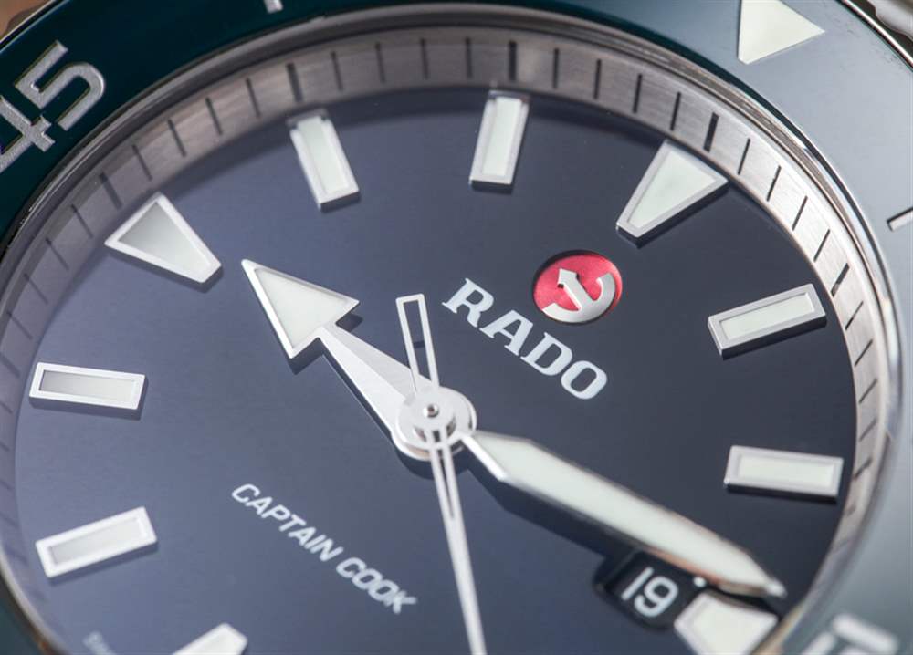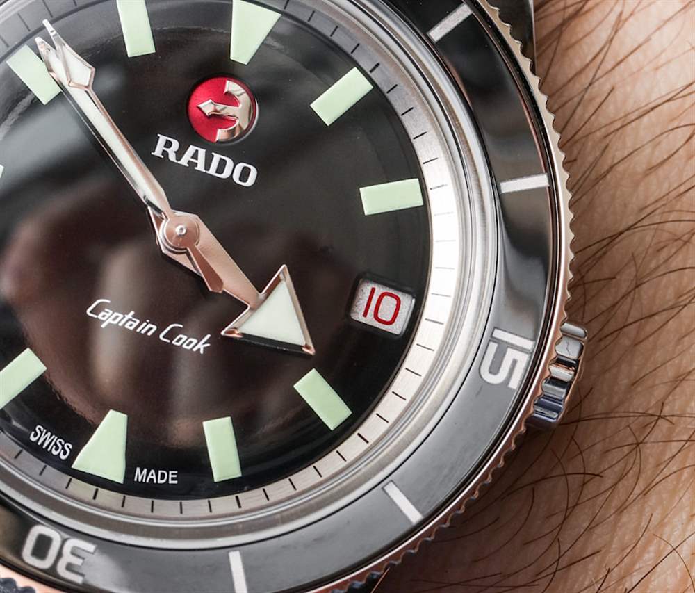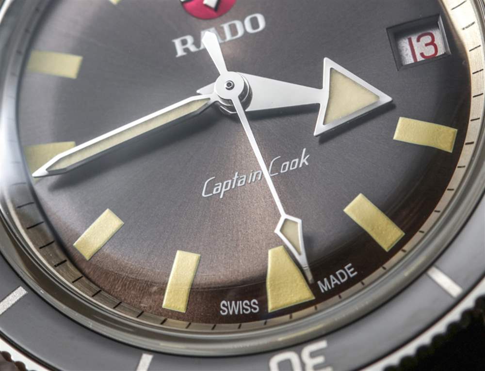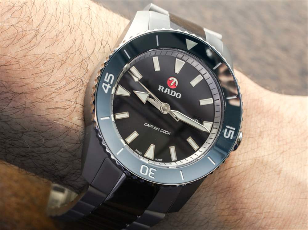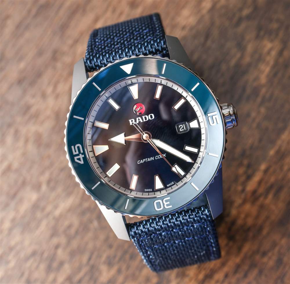 雷達需要進入樂趣,而庫克船長是那些迷人而古樸的設計之一,今天仍然看起來不錯。2017 款的設計與原始款相似,37 毫米寬的尺寸也“忠實于原始”——這意味著它們看起來確實像舊手表。除了外觀之外,RADO 庫克船長手表在材料和結構方面都非常現代。這些 37 毫米寬的型號采用精鋼制成,拋光精美,并具有向內傾斜的陶瓷表圈(各種顏色),看起來非常酷。我也喜歡帶有獨特而有力的指針以及清晰時標的表盤。Rado 無法真正決定流明顏色——因此三個 37 毫米寬的型號中的每一個都有不同的發光色調。