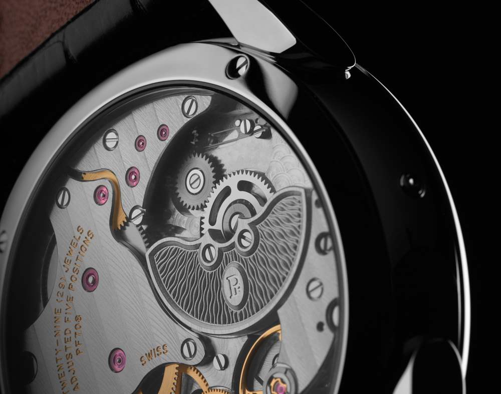 PF708 自動機芯裝飾精美,運行頻率為 3Hz(21,600 bph),動力儲存 48 小時。我不完全確定為什么它不是 4Hz 機芯,但現在這似乎并不重要。該機芯以 PF702 的輔助秒針布局為基礎,增加了日期復雜功能,以及 12 點鐘下方的醒目月相指示器窗口。Parmigiani 再次提供了一個“開放”的日期窗口,帶有幾個可見的數字,看起來像表盤底部的一個小笑容。細節非常好,但人們必須問自己,日期窗口是否需要這么大,以及如果日期盤顏色較深以匹配乳白色黑色表盤,它是否會看起來更有吸引力。廣告訊息廣告信息結束