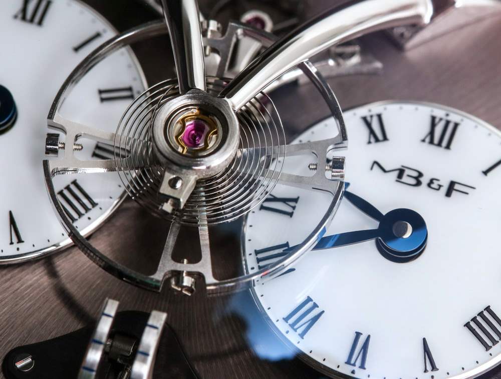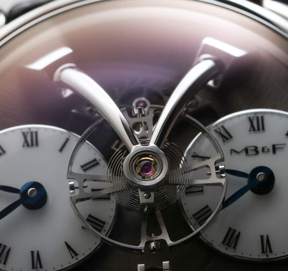 LM1 表殼再次為 44 毫米寬 x 16 毫米厚(由于顯著的圓頂藍(lán)寶石水晶)。它佩戴起來(lái)非常舒適,并包含專為 MB&F 生產(chǎn)的極其性感的手動(dòng)上鏈機(jī)械機(jī)芯。該機(jī)芯在 Kari Voutilainen 的工作室完成,最初由 Jean-Francois Mojon 設(shè)計(jì)。該機(jī)芯由 279 個(gè)零件制成,運(yùn)行頻率為 2.5Hz(18,000bph),動(dòng)力儲(chǔ)存為 45 小時(shí)。相對(duì)較慢的擺輪頻率是故意的,以便用戶可以通過表盤更好地查看調(diào)節(jié)機(jī)構(gòu)的動(dòng)畫,因?yàn)閿[輪突出顯示在面部的橋上。
