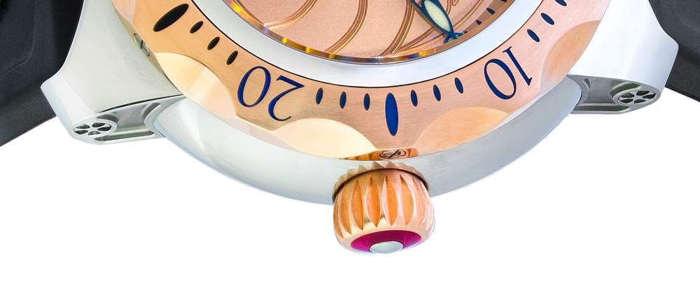 顯然,出于幾個原因,旋轉(zhuǎn)表圈值得關(guān)注。根據(jù) Geoffrey Roth 的說法,表圈是“無聲的”。這意味著它可以感覺像任何標(biāo)準(zhǔn)的旋轉(zhuǎn)潛水員表圈,但在轉(zhuǎn)動時不會發(fā)出聲音。具有諷刺意味的是,許多手表愛好者非常喜歡旋轉(zhuǎn)表圈在轉(zhuǎn)動時發(fā)出的聲音——所以并不是每個人都會喜歡這個功能。表圈有用于標(biāo)記的陶瓷聚合物鑲嵌材料,12 點(diǎn)鐘位置的流明尖上方有一個小的橢圓形藍(lán)寶石水晶,以保護(hù)它 – 觸感很好。