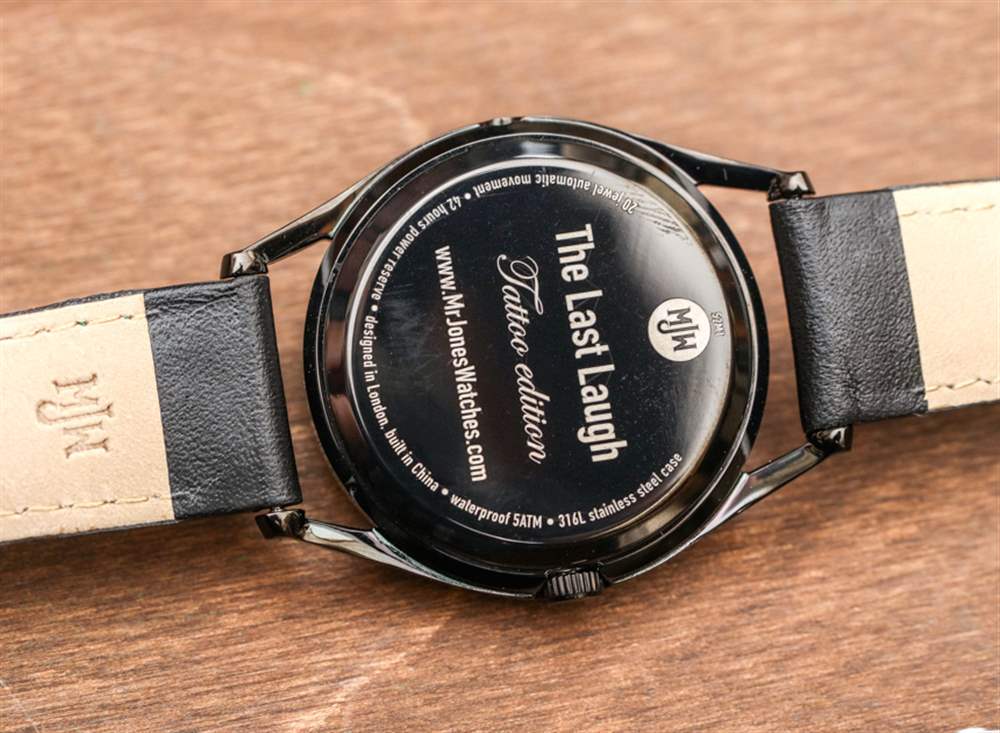 表殼為鋼制,防水深度為 50m,并帶有礦物水晶。Mr. Jones Last Laugh Tattoo 的表殼為黑色 PVD ??涂層,而其他表殼則為天然精鋼。質量是完全可以接受的價格。MJW Last Laugh Tattoo 的表盤藝術品是由英國紋身藝術家 Adrian Willard 特別委托制作的。雖然大多數 MJW 手表是石英的,但該型號配備了中國制造的 ST1721 自動機械機芯,可驅動指示小時和分鐘的圓盤“牙齒”。