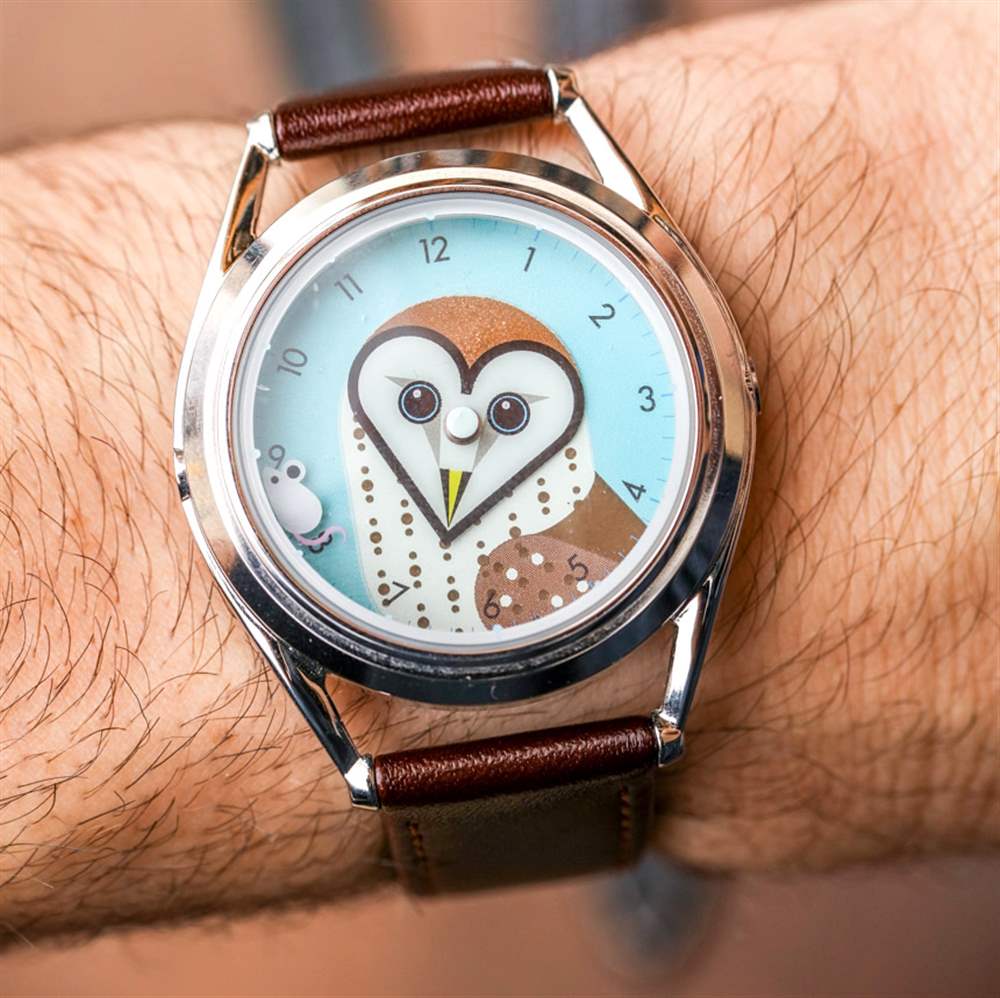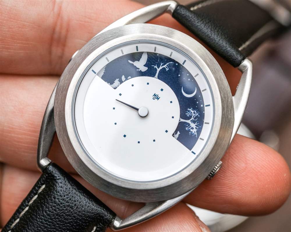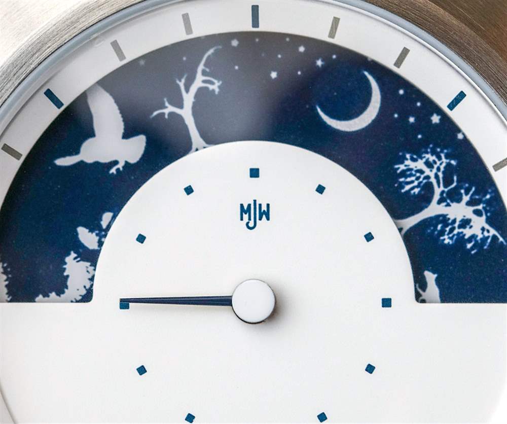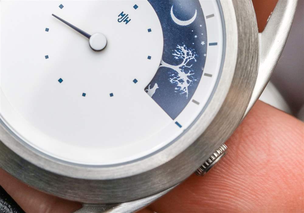 讓我們以較輕的語氣,將注意力轉移到Mr. Jones Sun and Moon 腕表,它是一種看時光流逝的藝術表現。很少有 MJW 手表以傳統方式簡單地指示時間。在這款腕表中,通過表盤頂部的新月形窗口可以看到代表白天和黑夜(以及各種植物和動物)的藝術圓盤。下面是一個傳統的表盤,用于指示分鐘。根據是一天中的上午還是下午,太陽或月亮代表小時的指示器。