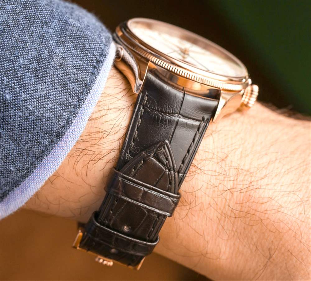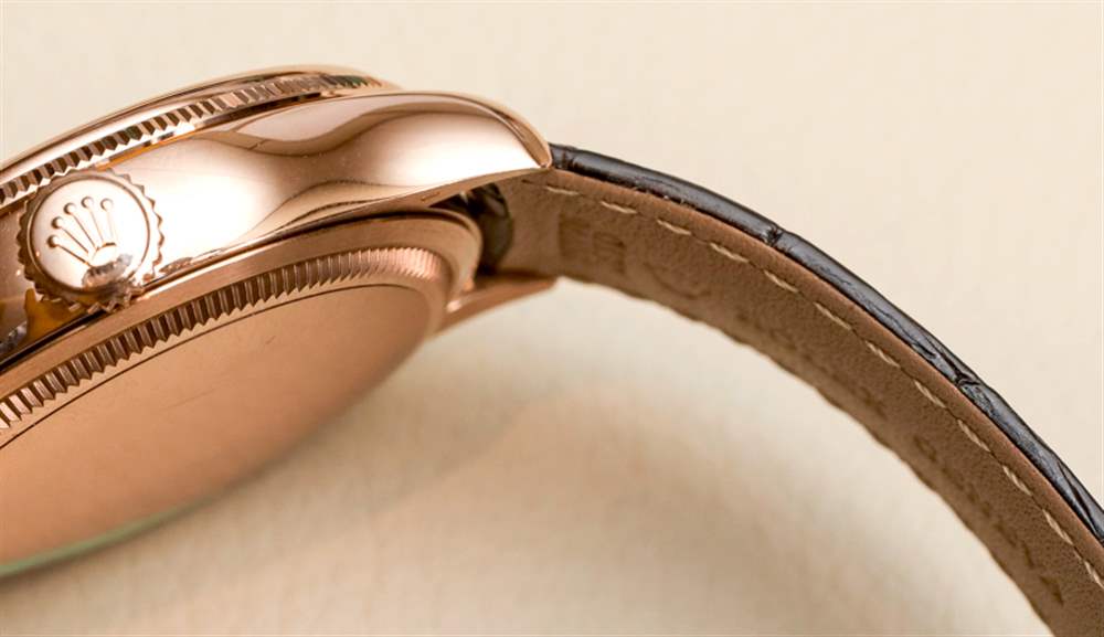 比只有時間的勞力士切利尼略厚——勞力士切利尼月相表殼也是 39 毫米寬,并有 18k 永恒玫瑰金可供選擇。經(jīng)典表殼的厚度與適中的表殼直徑相結合,使這款腕表給人以愉悅、厚實的感覺,讓這款腕表顯得格外考究。附在表殼上的是一條相配的棕色鱷魚皮表帶。如果您想將手表與深色衣櫥搭配,我認為搭配黑色表帶也會很好看。
