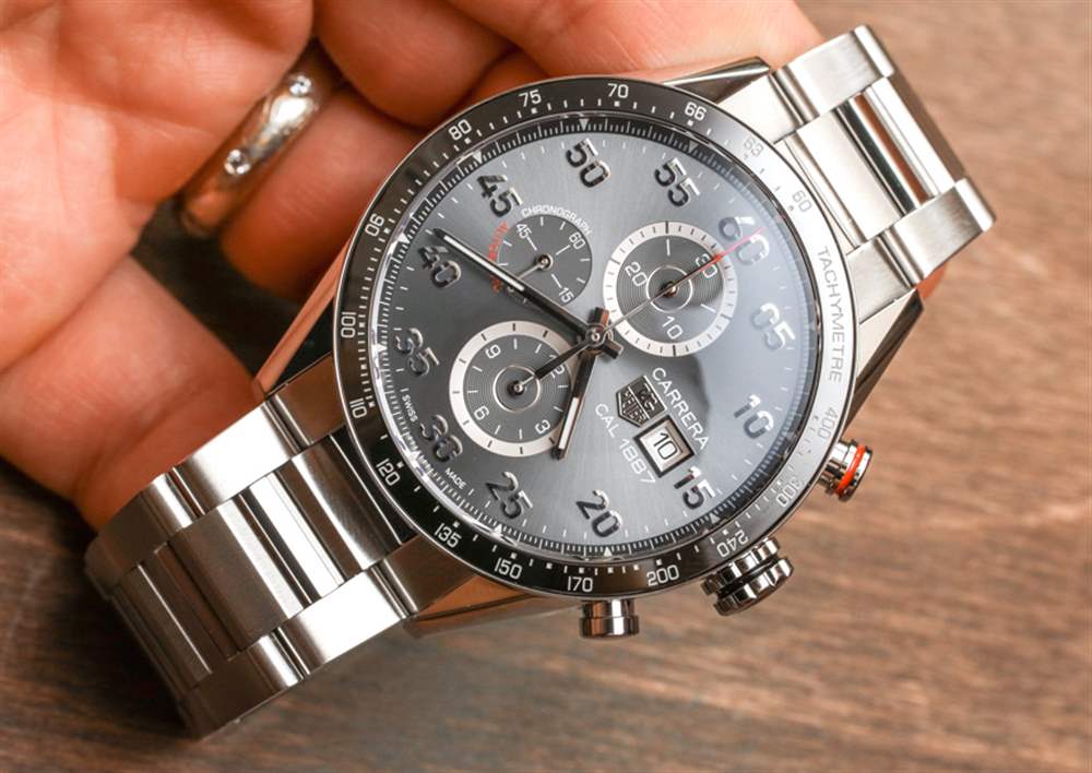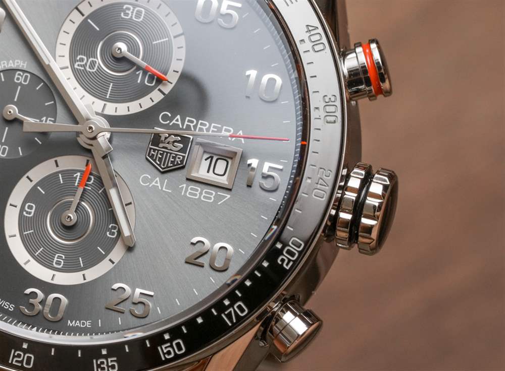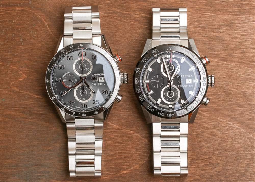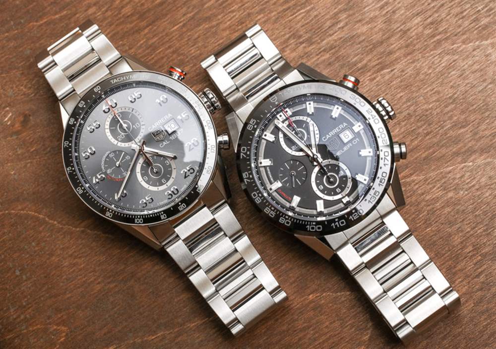 這兩款腕表分別是 TAG Heuer Carrera Calibre 1887 Automatic Chronograph 43mm reference CAR2A11.BA0799 和 TAG Heuer Carrera Calibre Heuer 01 Automatic Chronograph 43mm reference CAR201Z.BA0714。前一種型號(hào)是灰色表盤的,但泰格豪雅也生產(chǎn)幾乎相同的 Carrera 1887,全黑表盤(以及其他型號(hào)),型號(hào)為 CAR2A10.BA0799。
