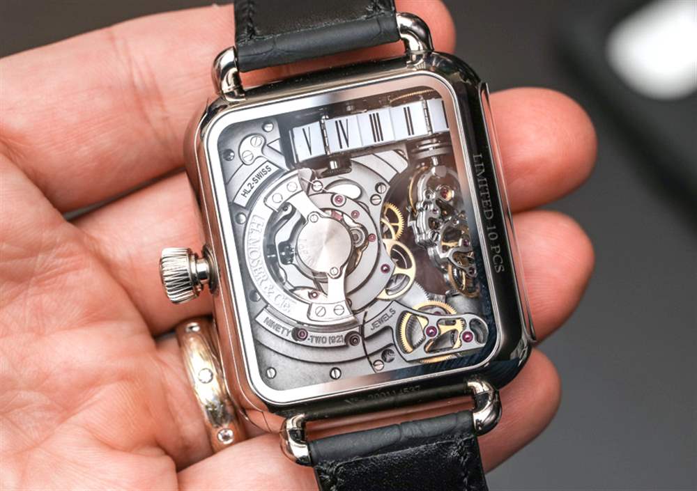 該機芯是帶有微型轉子的自動機芯,其中一個發條盒專門用于為時標鏈帶的復雜運動提供動力。機芯運作的真正美妙之處在于,每經過一小時,時標帶會緩慢移動幾秒鐘。這是一件很酷的事情。HL2.0 機芯還有一個分鐘逆跳指示器,在 H. Moser & Cie Swiss Alp Watch Minute Retrograde 時計上,該指針與白色大明火琺瑯表盤(采用傳統設計的藍鋼指針)相對。機芯底部是一個方便的動力儲存指示表盤——我一直很欣賞。