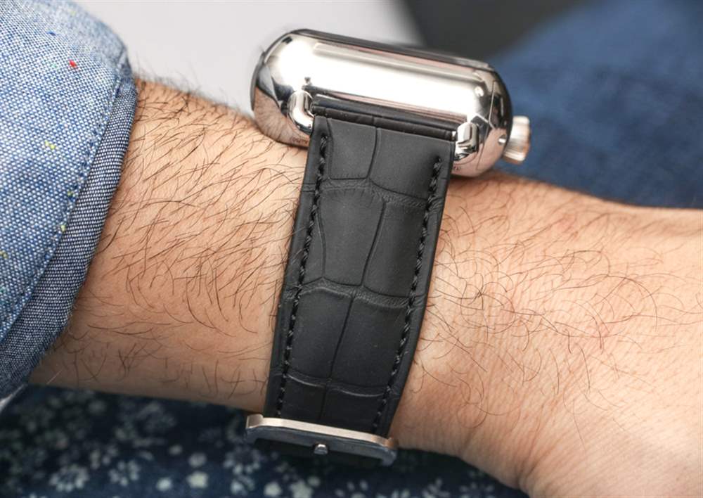 H. Moser & Cie Swiss Alp Watch Minute Retrograde 這款限量版的表殼采用 18k 白金制成,尺寸為 42.1 毫米寬、18.3 毫米厚和 48 毫米長。它絕不是謹慎的,它像一小塊肥皂(帶凸耳)一樣戴在手腕上的鱷魚皮表帶上。這本質上是 H. Moser & Cie 生產的表殼的膨脹版本,看起來就像 Apple Watch,但里面有一個機械機芯。