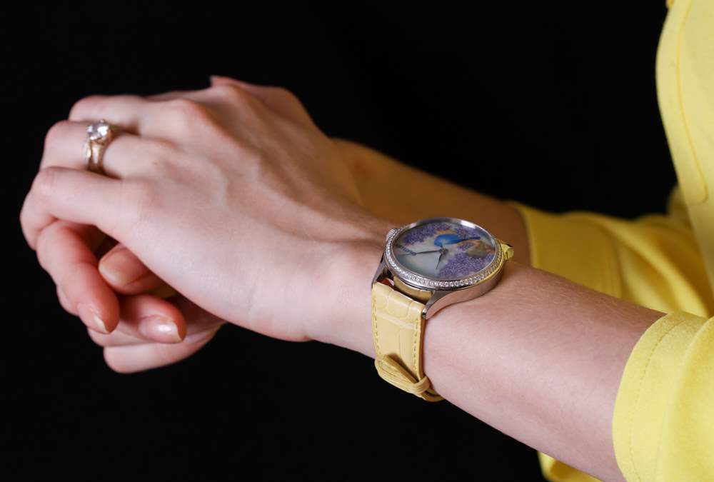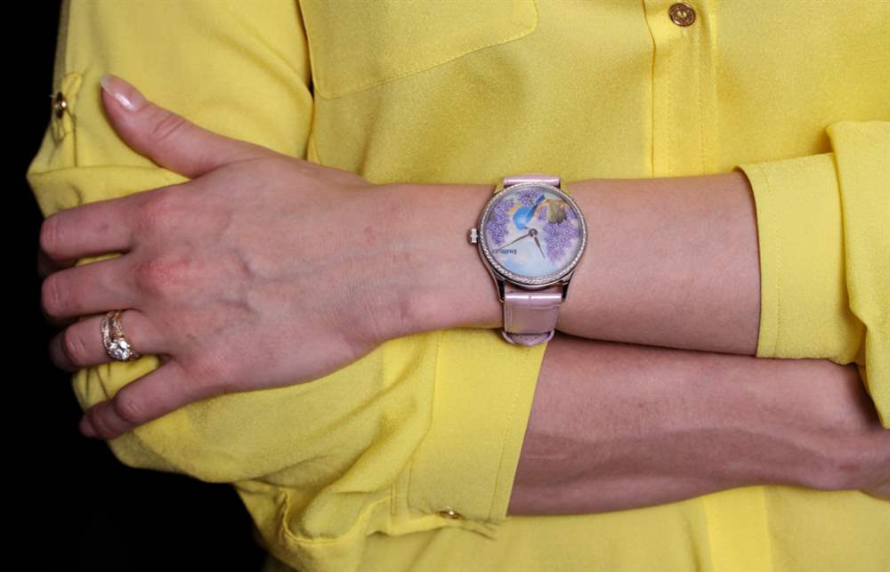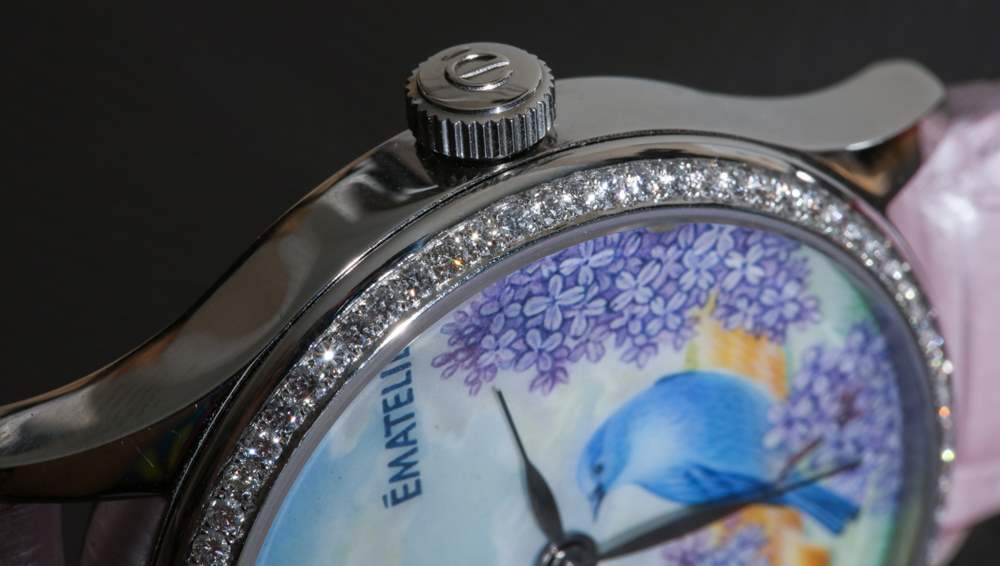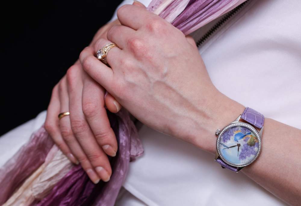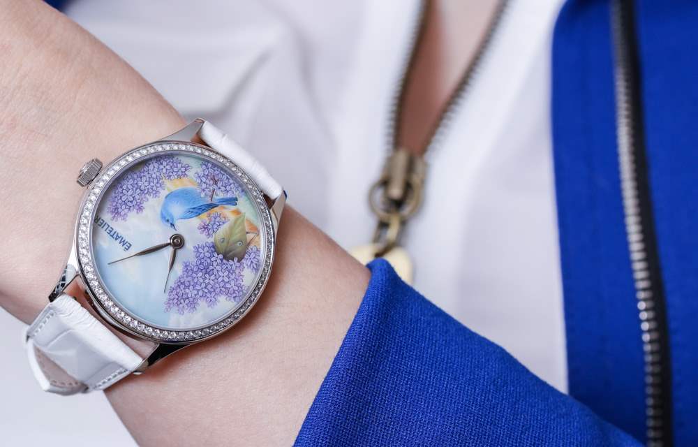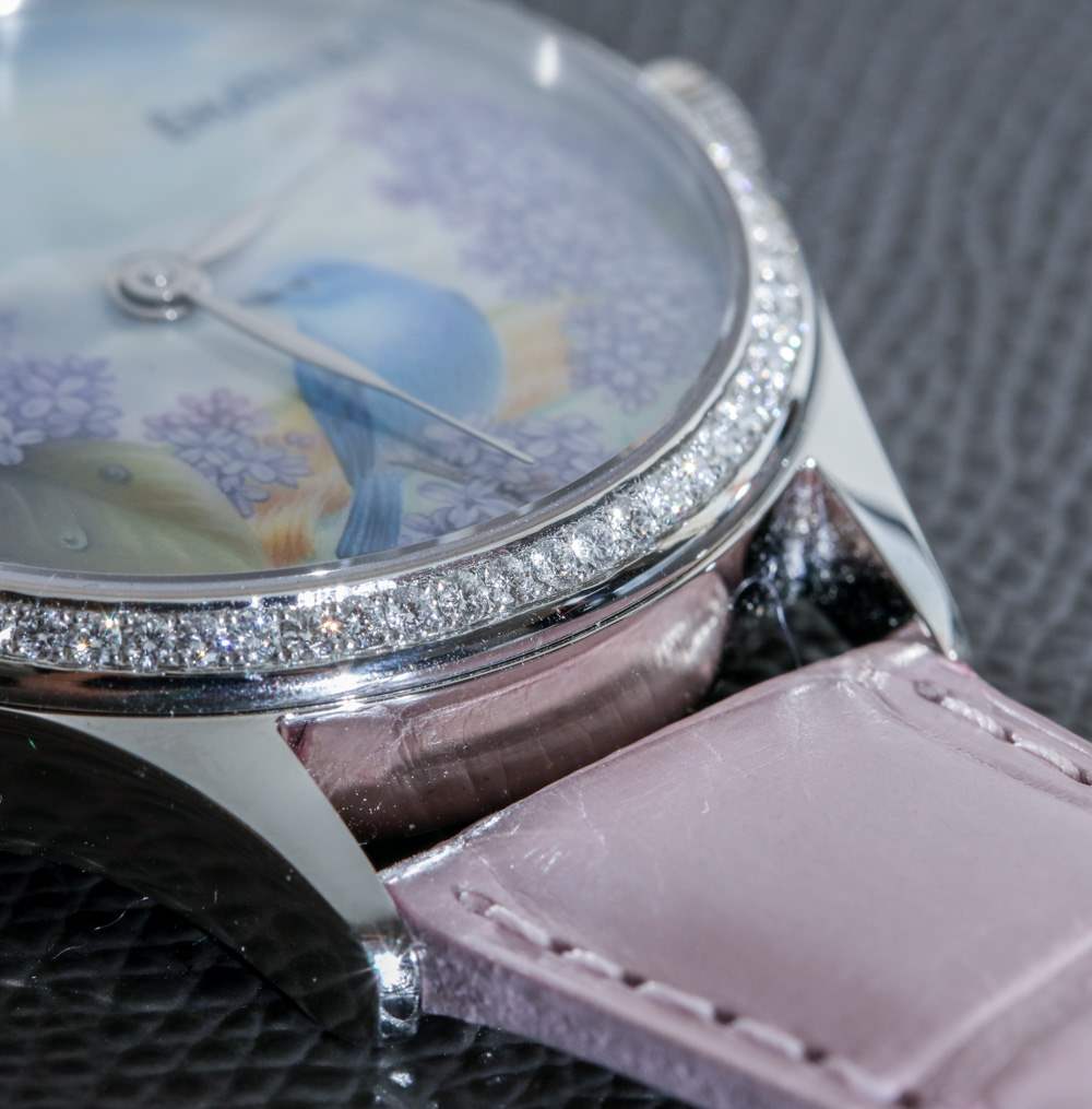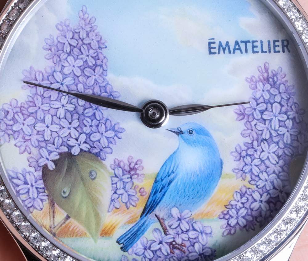 我正在寫的這款特別的手表被描述為 ématelier Harmony Lilacs and Bluebird。豐富的紫色和藍(lán)色組合在一起,融合了紫丁香的魅力、鳴禽的親切友好和鄉(xiāng)村景觀的寧靜。它描繪了一個(gè)可能確實(shí)存在于某個(gè)地方的奇幻地方,至少在大多數(shù)人的記憶中是這樣。