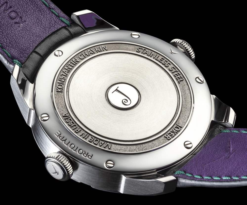 Konstantin Chaykin Joker 表殼的每一側(cè)都有一個(gè)表冠(實(shí)際上,左側(cè)只是一個(gè)用于調(diào)節(jié)月相的嵌入式推桿),用于充當(dāng)這張臉的耳朵。表殼為鋼制,寬 42 毫米,厚 13.7 毫米。設(shè)計(jì)經(jīng)典,但充滿活力,略帶運(yùn)動(dòng)感。表盤(pán)上方是藍(lán)寶石水晶,定制表帶是鱷魚(yú)皮,綠色縫線和深紫色小牛皮襯里。廣告訊息廣告信息結(jié)束
