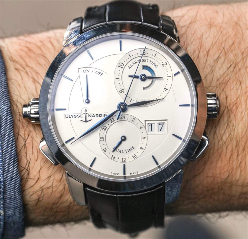 為了簡(jiǎn)單地解釋復(fù)雜性,我會(huì)說它提供時(shí)間、一個(gè)大日期指示器、帶有專用“前進(jìn)和后退”按鈕的雙時(shí)區(qū),以及一個(gè)獨(dú)特的警報(bào)系統(tǒng),它結(jié)合了傳統(tǒng)警報(bào)和一分鐘的提示音中繼器。請(qǐng)注意,鬧鈴設(shè)置轉(zhuǎn)盤中還有一個(gè)專用的動(dòng)力儲(chǔ)備指示器,可讓您了解鬧鈴彈簧是否有電。所有這些都在平衡但不對(duì)稱的表盤上進(jìn)行了相當(dāng)合乎邏輯和吸引力的布局。廣告訊息廣告信息結(jié)束