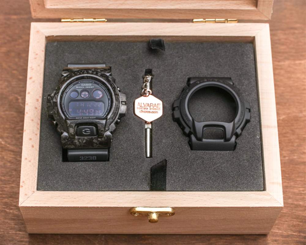 Alvarae 給我寄來了他們的鍛造碳纖維裝甲版本的 Casio G-Shock DW6900MS-1 手表。這是卡西歐著名的 DW6900 (DW-6900) 系列的啞光黑色“最小化”版本,毫無疑問,這是一個光滑的外觀。它的零售價僅為 99 美元。這個盒子與您期望在其中找到 G-Shock 手表的盒子完全不同,這是一種有趣的古怪觸感。Alvarae 拋棄了 G-Shock 粉絲熟悉的卡西歐圓形金屬容器,轉(zhuǎn)而采用帶有華麗閂鎖的未完成木盒。你永遠(yuǎn)不會猜到它里面是一個 G-Shock。