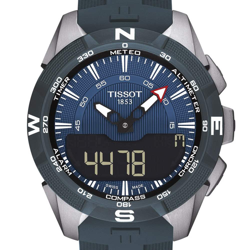 如果您不熟悉天梭 T-Touch 系列,這個概念非常簡潔。基本理念是通過按壓藍(lán)寶石水晶上的不同位置來使用功能。因此,如果您在表盤外圍看到(例如)“高度計”,您首先按下表冠按鈕,然后將手指按在水晶的那個區(qū)域,手表進(jìn)入高度計模式,指針和部分?jǐn)?shù)字屏幕協(xié)同工作以指示當(dāng)前高度。作為一款“三重傳感器”手表,T-Touch Expert Solar II 擁有氣壓計、高度計和指南針(后者是目前為止最有趣的)。天梭聲稱 T-Touch Expert Solar II 有 20 種功能,從多個時區(qū)和計時碼表(包括單圈和帆船賽)到萬年歷和兩個不同的警報。