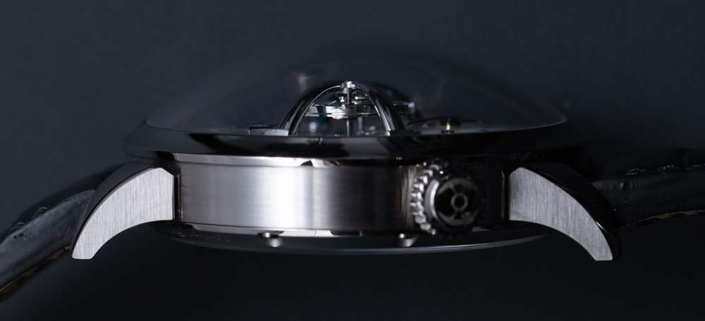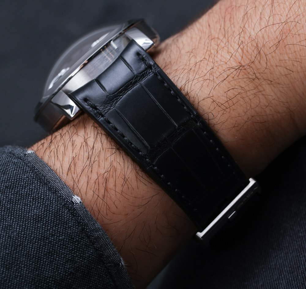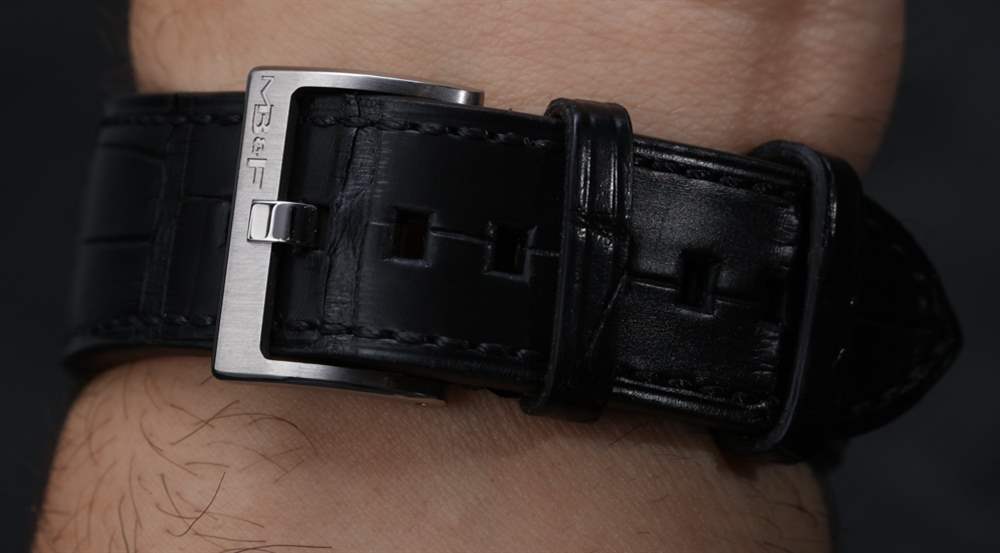 機(jī)芯由 241 個零件制成,工作頻率為 18,000 次/小時(2.5 赫茲),單個主發(fā)條可提供 45 小時的動力儲存。這種更適中的操作速度可以讓您更優(yōu)雅地觀察兩個 11 毫米寬的擺輪在運(yùn)行中。MB&F LM2 外殼本身寬 44 毫米,厚 19 毫米(比之前的 LM2 外殼薄 1 毫米),防水深度達(dá) 30 米。它配有一條制作精良的黑色鱷魚皮表帶。