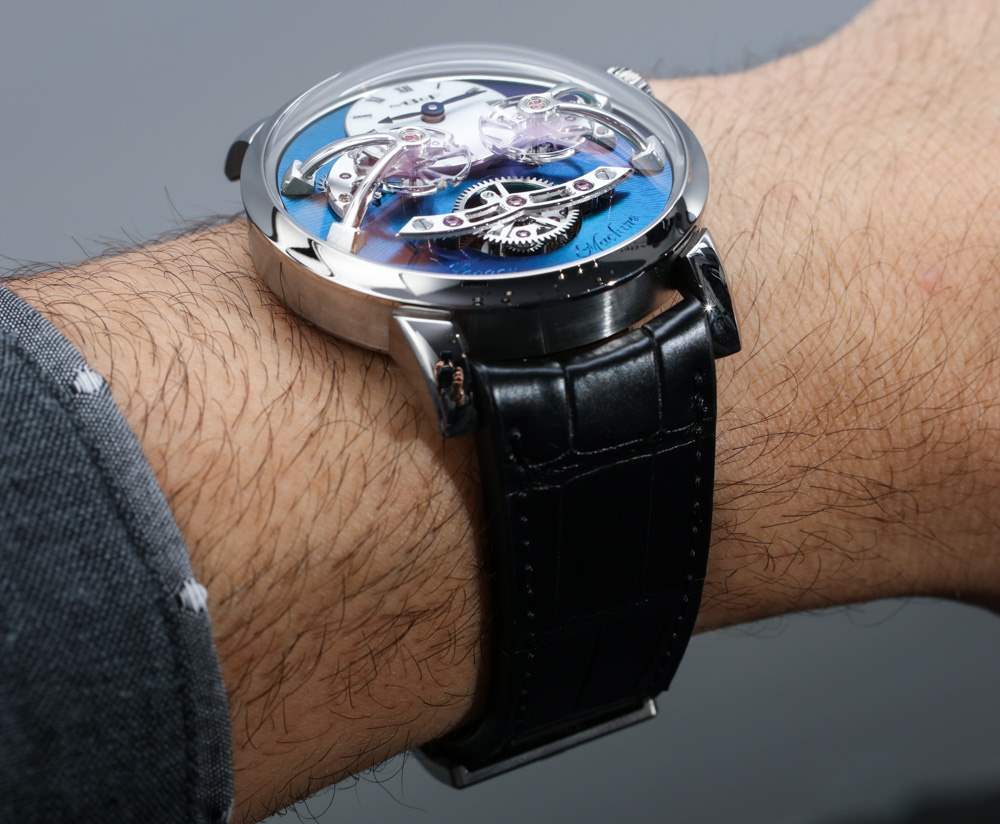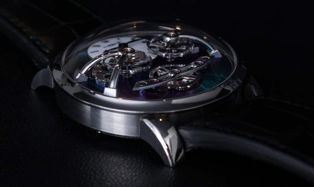 MB&F 顯然很享受讓他們的表盤供應(yīng)商使用飾面和著色工藝(我認(rèn)為這里是 PVD ??涂層工藝)。他們過去做過綠色,也做過藍(lán)色,現(xiàn)在他們提供了一種存在于中間某處的顏色,因?yàn)樗c光一起玩。有趣的是,MB&F 甚至沒有嘗試自己給這種顏色起個名字。表盤的其余部分由偏心的白色時間子表盤和藍(lán)色 18k 金時針和分針,以及平衡輪的雙拱形橋板和行星差速系統(tǒng)的視圖組成。當(dāng)您凝視著豐富的三維鐘表雕塑時,完成是一流的和華麗的。