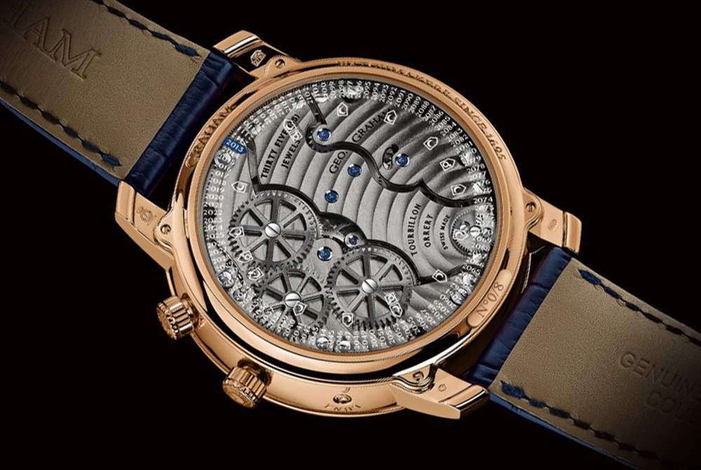 表盤上最大的太陽系特征是太陽,它以真正的巴洛克風格呈現,陀飛輪上方有一個手工雕刻的 18k 玫瑰金橋板,如果仔細觀察,它里面有雙鳳頭。據說所有這一切都受到該品牌同名喬治格雷厄姆很久以前生產的一臺機器的啟發。