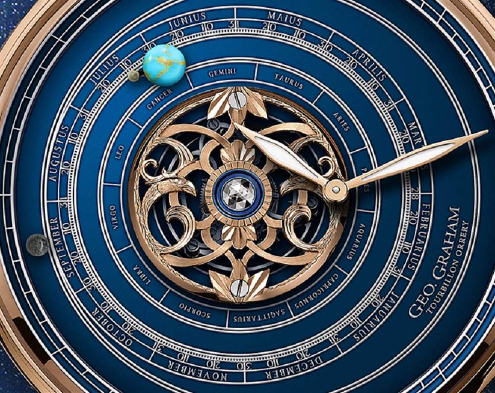 Graham Geo.Graham Orrery Tourbillon 內部的機芯是機芯 G1800 Tourbillon Orrery,以 3 赫茲(21,600 次/小時)的頻率運行,動力儲存為三天。表殼大,寬 48 毫米(厚 17.6 毫米),由 18k 玫瑰金制成。防水性為 50m……所以在了解火星離我們的藍色星球有多遠的同時,輕輕游泳。