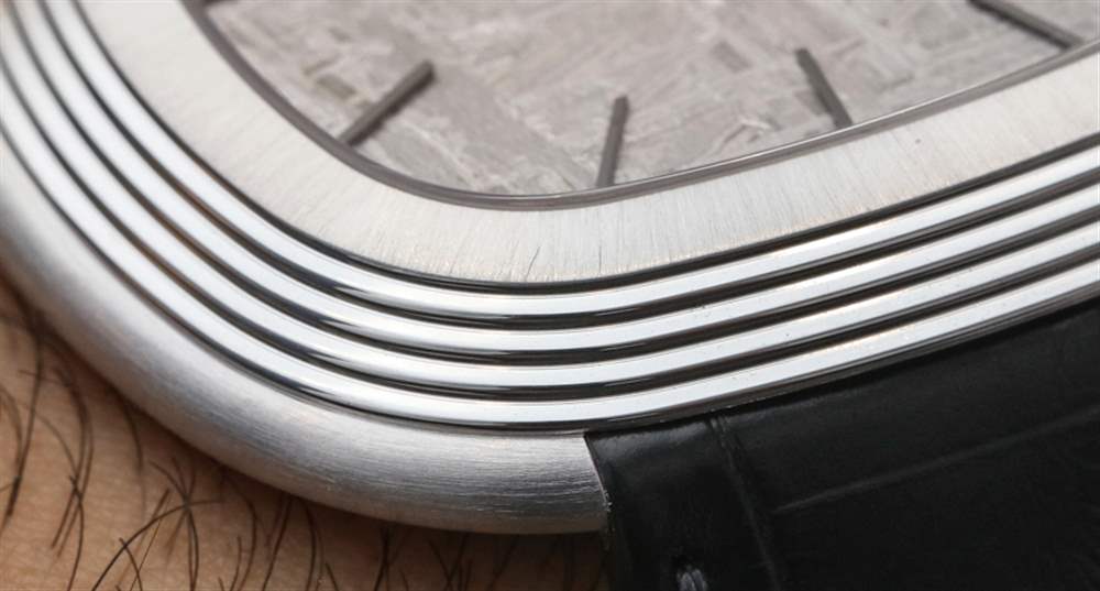 伯爵傾向于用細針式拋光指針制作光面表盤。這種閃閃發(fā)光的組合營造出優(yōu)雅的外觀,但當暴露在……光之類的東西下時,易讀性真的會受到影響。白色隕石的磨砂表面與黑色指針和時標混合在一起,形成完美的對比,使易讀性和風格和諧地保持完好。這是伯爵最幸福的時刻,我真的希望這種表盤設計能在未來出現(xiàn)在更多手表中,比如 Altiplano 系列中的手表。