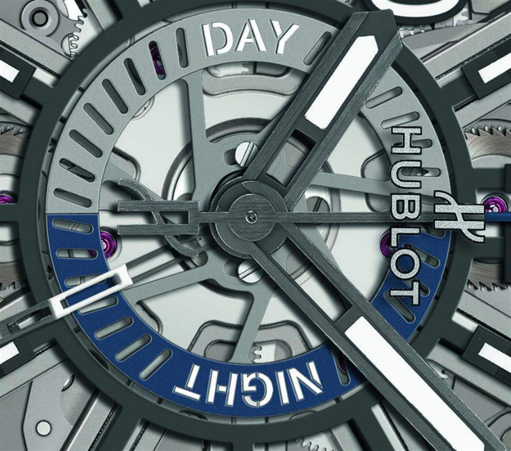 HUB1251 自動機芯由 339 個零件制成,工作頻率為 4 赫茲(28,800 次/小時),動力儲存三天(72 小時)。除了有兩個時針指示本地和家鄉時間外,還有一個特殊的日/夜盤用于指示第二時區的上午或下午。對我來說,這是一個非常重要的功能,因為在不使用 24 小時時間格式的 GMT 手表中,很難知道“本地時區”是白天還是黑夜。有了這個圓盤,宇舶表Big Bang UNICO GMT的佩戴者便擁有了非常清晰的兩個時區時間的獲知能力,具有高度的便利性和易讀性。