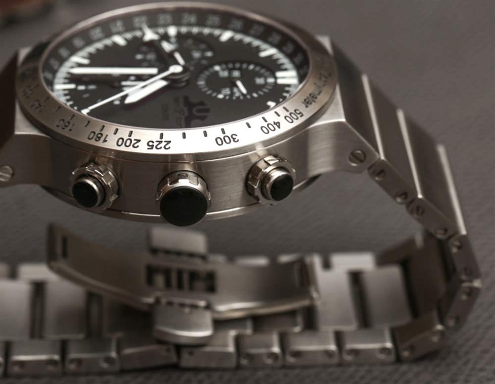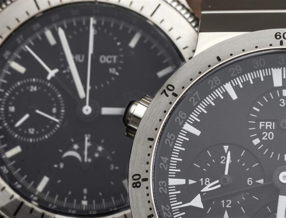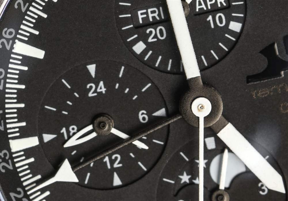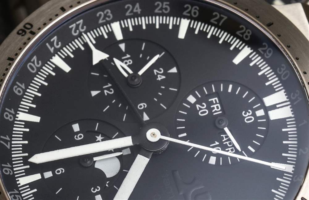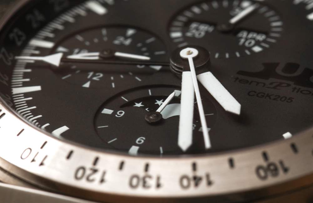 Valjoux 7751 自動(dòng)機(jī)芯本質(zhì)上是 7750,但增加了一些額外的復(fù)雜性?;A(chǔ)機(jī)芯帶有 12 小時(shí)計(jì)時(shí)碼表,7751 型號(hào)增加了一個(gè)完整的日歷,帶有星期和月份窗口以及日期指針、帶 AM/PM 指示器的同步 24 小時(shí)指針和一個(gè)月相指示器。雖然完整的日歷不像年歷或萬(wàn)年歷那么花哨,但使用表冠和 10 點(diǎn)鐘位置的旋入式按鈕,可以在需要時(shí)相對(duì)輕松地調(diào)整日歷數(shù)據(jù)。