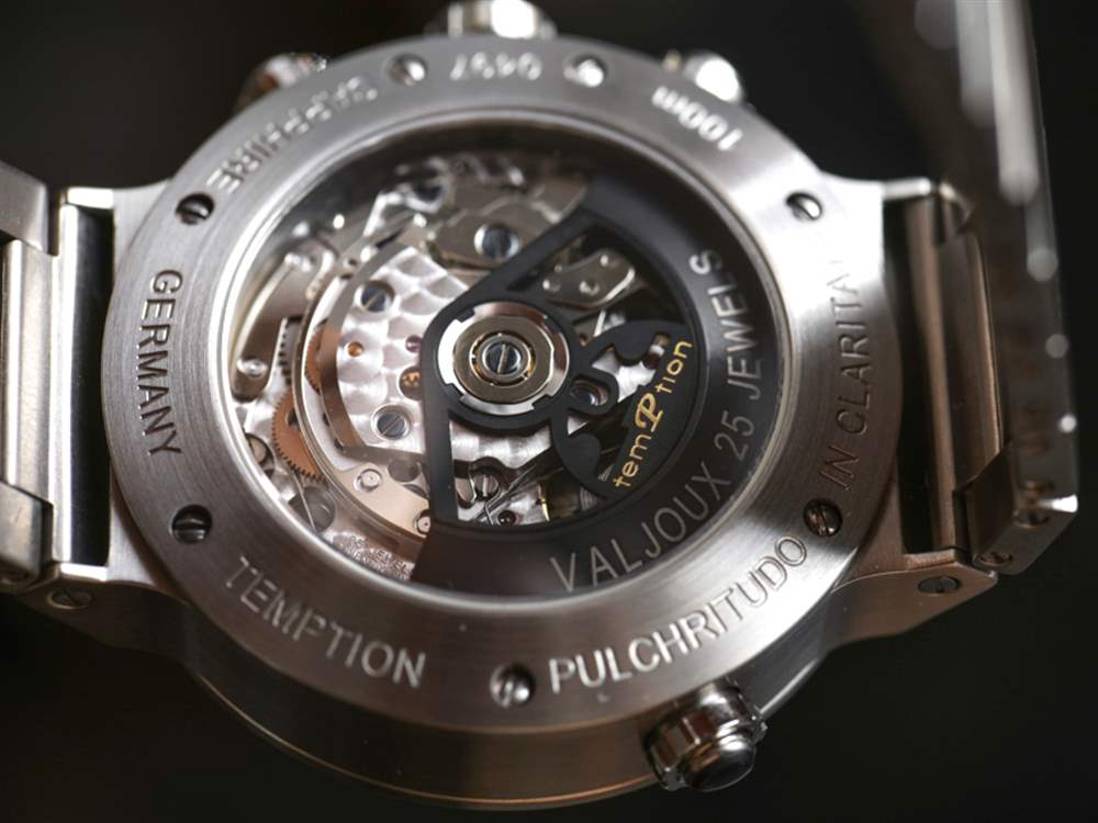 在評(píng)論視頻中,您可以看到我將 Temption CGK203 與此 CGK205 進(jìn)行了比較。主題和機(jī)芯是相同的,但在表殼、表盤(pán)、水晶和表鏈方面,它們是不同的手表。手表內(nèi)部是瑞士ETA Valjoux 7751自動(dòng)計(jì)時(shí)機(jī)芯。這種不太受歡迎的機(jī)芯功能齊全,但很難設(shè)計(jì)表盤(pán)。話雖如此,它的功能也很合理。Temption 還碰巧提供了 7751 的完整裝飾版本,其中包括許多漂亮的珍珠拋光和藍(lán)鋼螺絲。