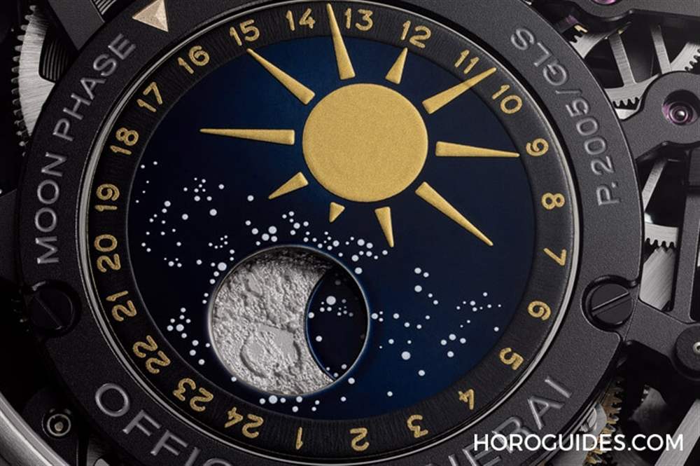 機(jī)芯背面配備日夜顯示盤,透過(guò)兩片互相交疊扣連的轉(zhuǎn)盤清晰顯示月相。上層轉(zhuǎn)盤畫有太陽(yáng)圖騰,搭配一枚小型指針顯示一天24小時(shí),以太陽(yáng)標(biāo)示白晝,并以星空標(biāo)示晚上;星空中央的小圓窗則顯示下層轉(zhuǎn)