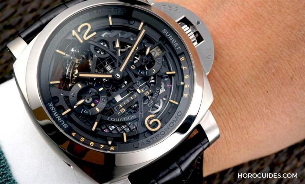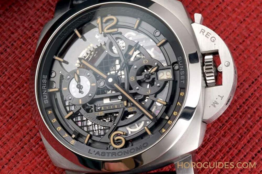 一般都說(shuō)沛納海看來(lái)看去就是三針,但沛納海一旦要做復(fù)雜功能也是動(dòng)真格的。這只L’Astronomo-Luminor 1950 Tourbillon Moon Phases Equation of Time GMT陀飛輪月相時(shí)間等式兩地時(shí)間腕表PAM00920,表面鏤空酷黑,表背華麗的日夜轉(zhuǎn)盤更是一大看點(diǎn)。