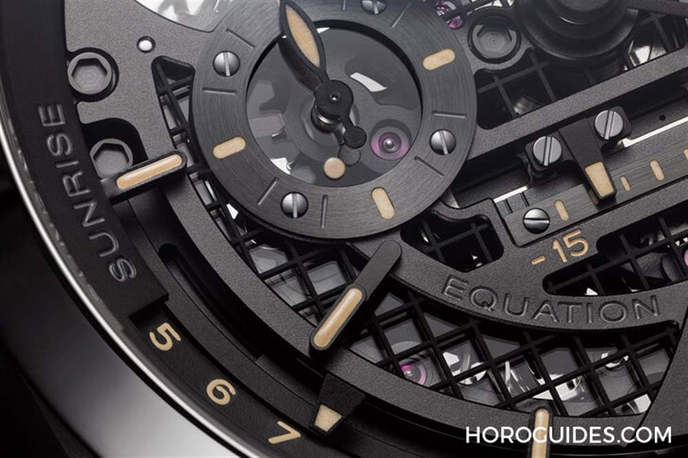 手動(dòng)上鏈P.2005/GLS機(jī)芯采大幅度鏤空,鏤空的網(wǎng)格撞表盤形成一種繁復(fù)的工業(yè)感,10點(diǎn)鐘位置的陀飛輪裝置旋轉(zhuǎn)一圈僅30秒(一般陀飛輪旋轉(zhuǎn)一圈為60秒),9點(diǎn)鐘為小秒盤、3點(diǎn)鐘為日期窗、6點(diǎn)鐘位置則是直線式顯示的時(shí)間等式。