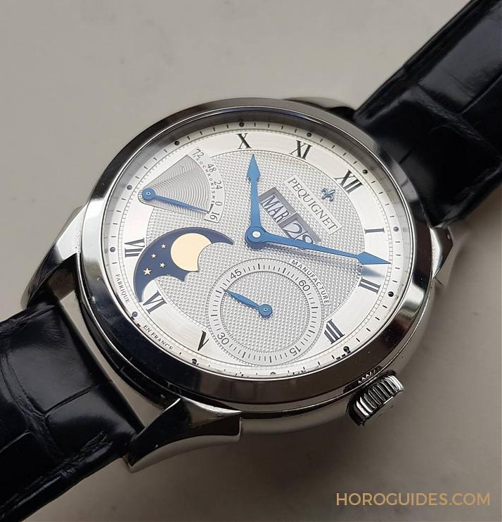 沒有太多人認識的法國品牌,機能性蠻強,面盤布局有特色,機刻雕紋,尤其直立式月相盤。機芯不是頂高級,但也屬于中上水準的專用機種,有JLC, Zenith的等級,拋磨修飾有到位。雙向自動上鏈,慣性螺絲微調擺輪(以4顆螺絲微調走時快慢) ,3日動力儲備。品牌經營有些問題,卻也是入手的好時機。