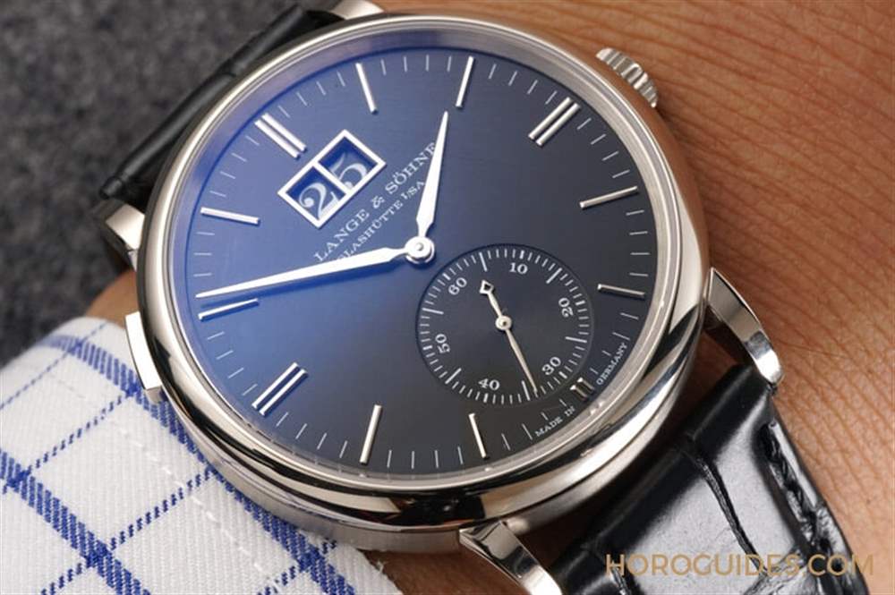 黑表盤版本的Saxonia Moon Phase,12點鐘為招牌的大日期視窗,黑底白字的日期盤看起來更為清楚,6點鐘為月相,表徑40mm,有白金或玫瑰金材質。參考價EUR 28,500。詳細介紹看這里