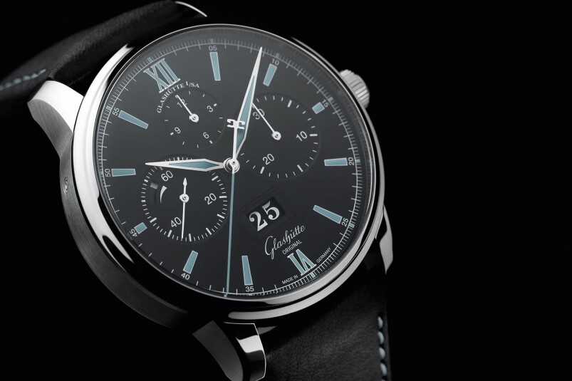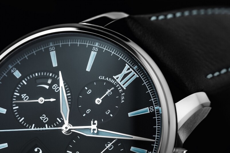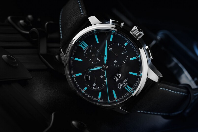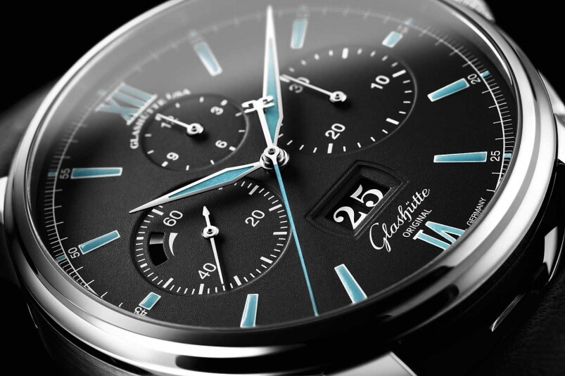 Glashütte Original的手表,是我每次于表展時見到戴上后,久久都不舍得脫下來的,這枚Senator Chronograph Panorama Date猶甚。這款計時腕表的設計增添了運動風貌。黑色的表盤之上,是極之搶眼的亮藍色時標,涂上了Super-LumiNova 夜光涂料,因此這些藍色時標、以及時分鈔針都會在黑暗之時,發出迷人的藍色夜光,令人總是忍不住在黑暗之中,一而再地欣賞這一片藍光。