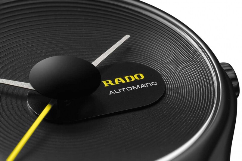 這款True真系列圓紋腕表是由Rado及Rainer Mutsch共同設計的腕表,是整個系列之中,我最想立刻擁有的腕表,全黑的簡約設計之中,帶著亮眼的黃色秒針及Rado標志,夠擔眼!但是細看一下,表盤亦非平面一片黑色,而是有著非對稱排列的下降階梯結構,帶來一種立體感,而指針的懸浮效果亦因而更加突出。而其圓紋設計,不只在表面,更一直延伸到表底,上面更有一個小型藍寶石玻璃窗口讓你可以看見機芯,帶來更多趣味。