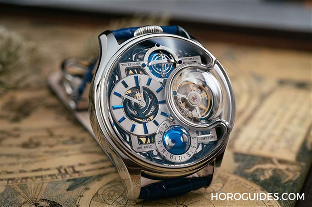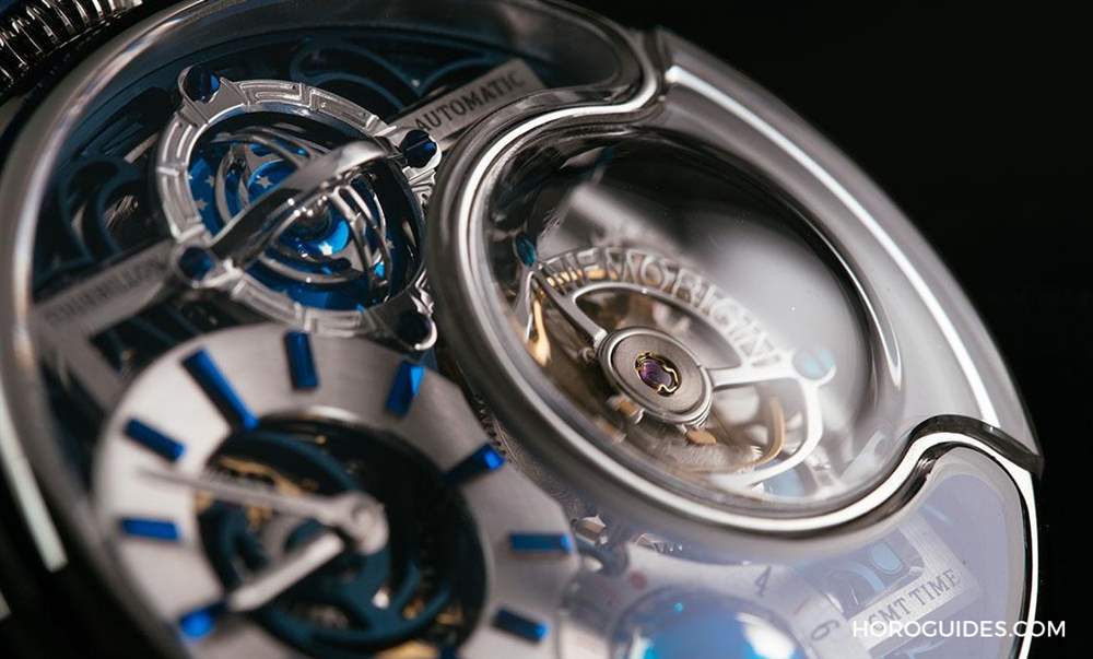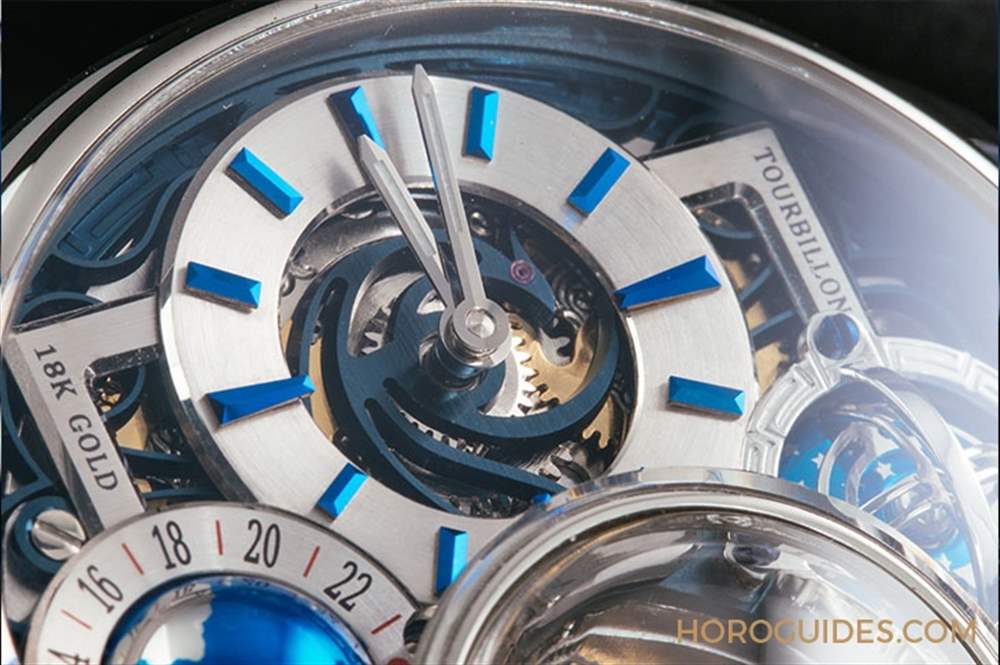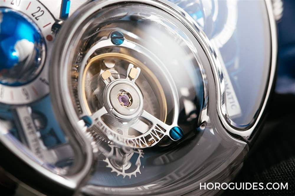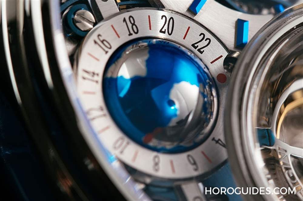 6點鐘位置的是球體GMT兩地時間顯示裝置,透過右上方的紅點指示第二地時間。