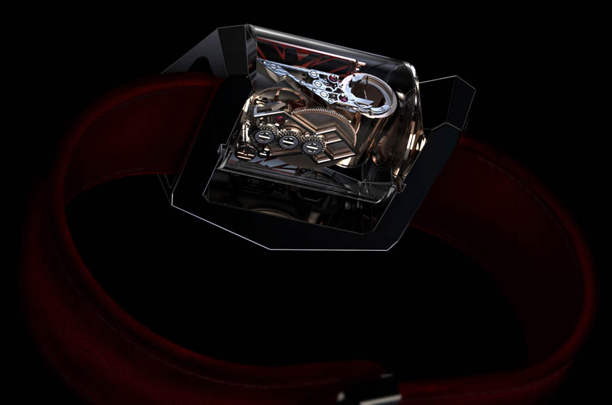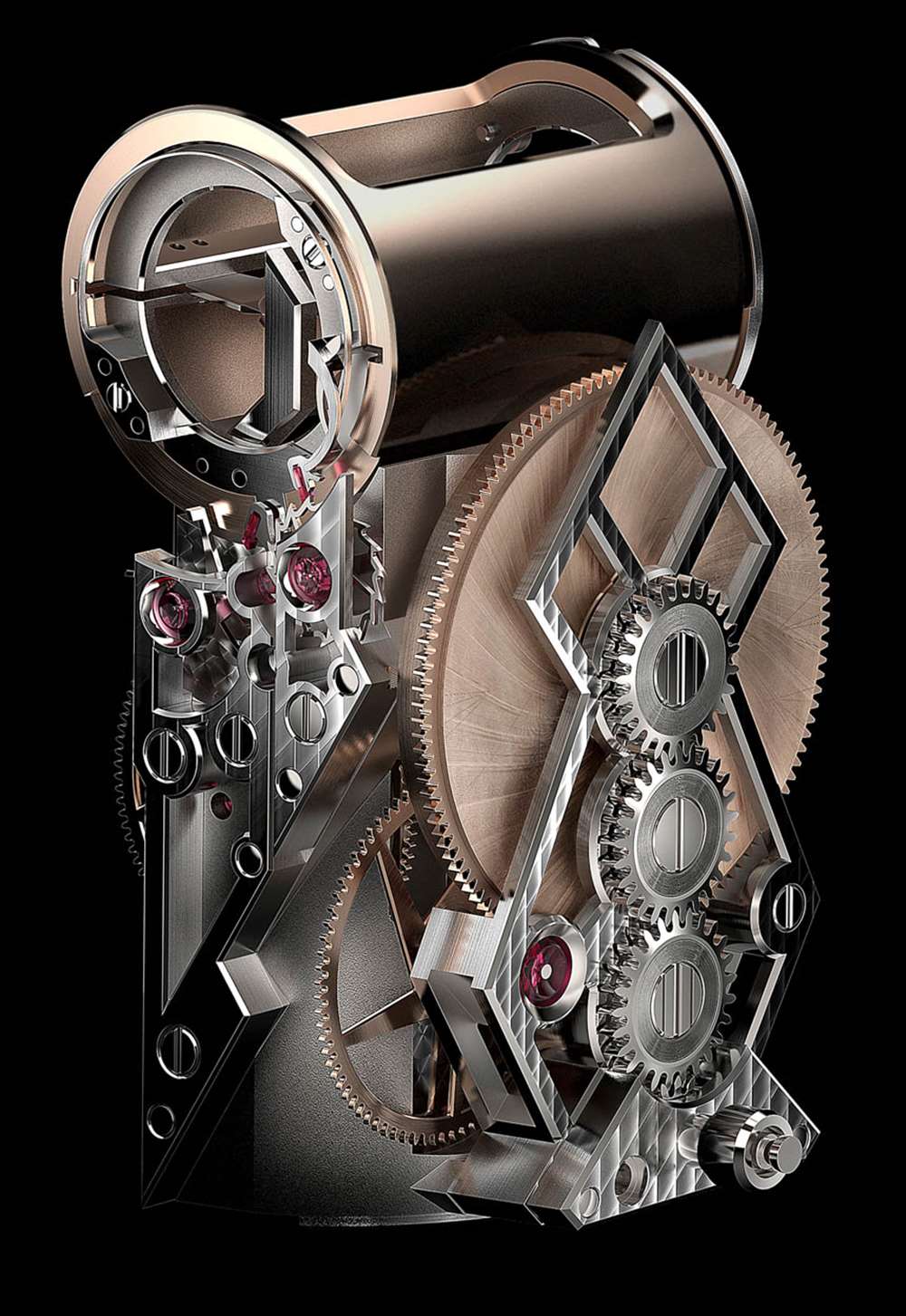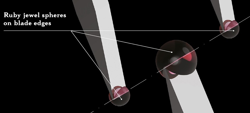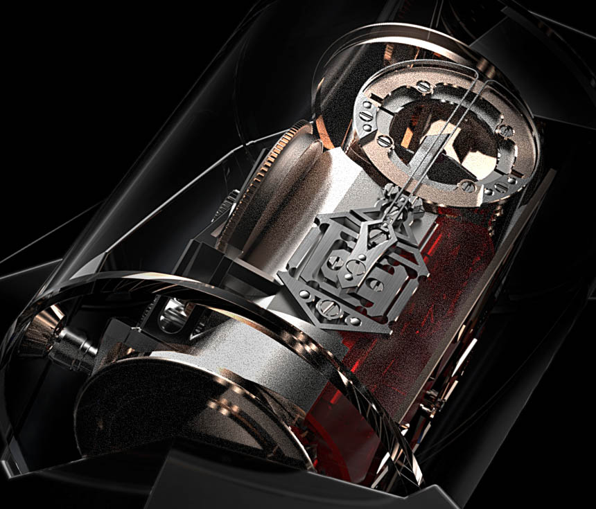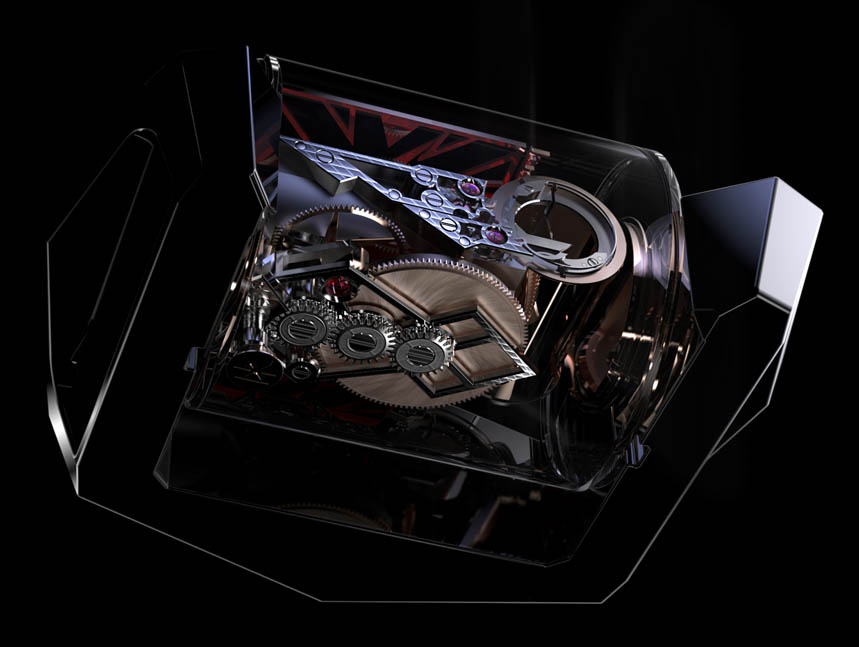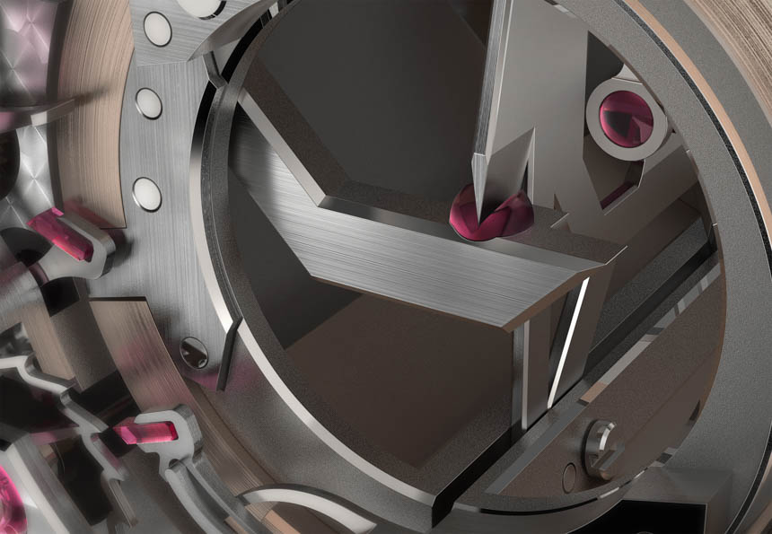一個看起來像剃須刀的組件有三個“刀片”,尖端鑲有 PAC-MAN 風格切割的合成紅寶石球體。在球體的這些切割空間中,刀片前后移動,連接到一個圓柱體以模擬擺輪的擺動拱形。與傳統擺輪相比,您可以看到振幅有多短。此外,連接到葉片諧振器的是一個擒縱系統,該系統利用其直接脈沖系統模擬天文鐘擒縱系統的優勢。直到最近幾年,我們才開始在腕表中看到傳統的棘爪式擒縱機構。可以說,天文鐘式擒縱機構對于總體計時結果來說更好,但很難設計到腕表中,因為它們對運動和震動非常敏感。