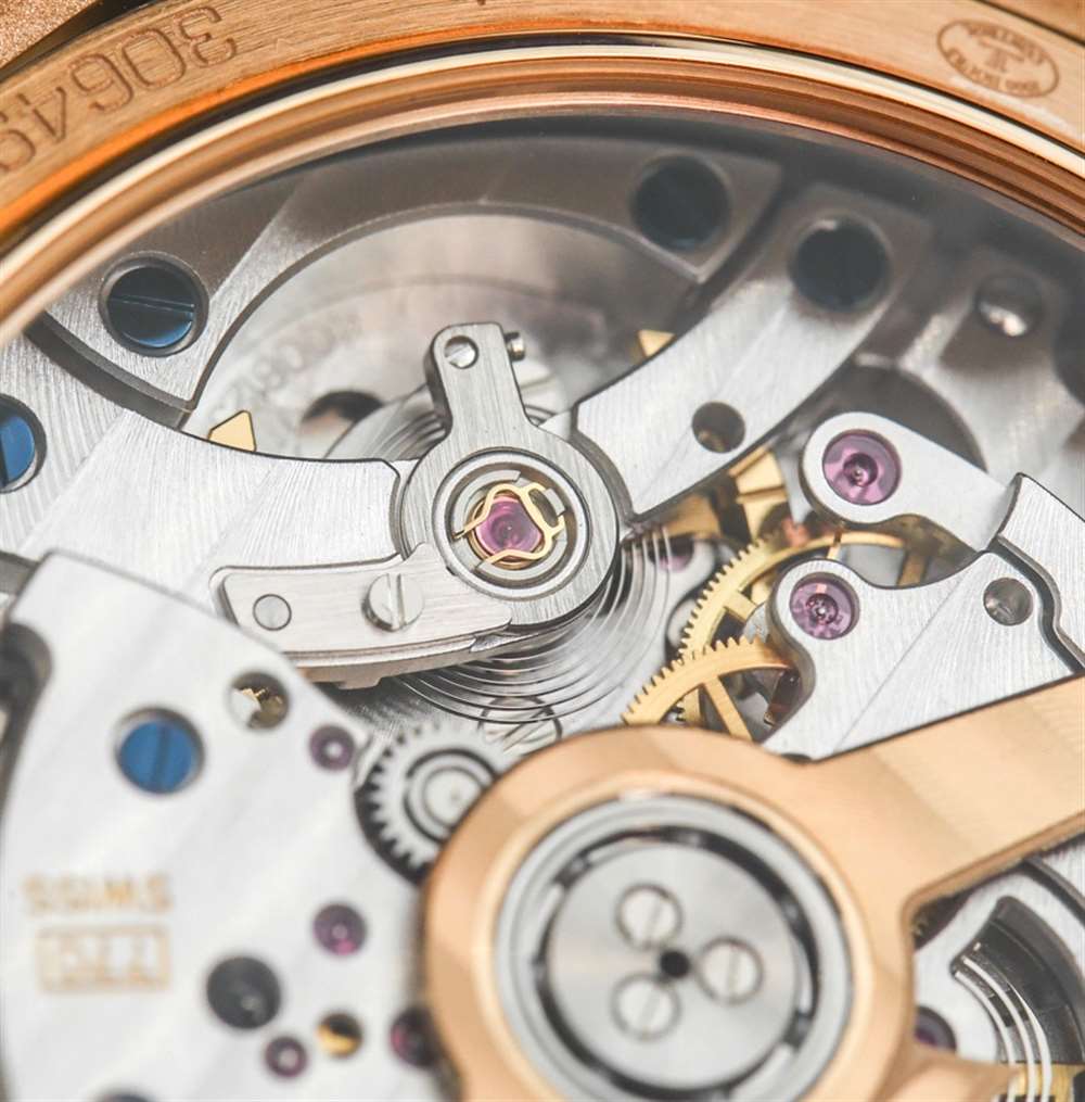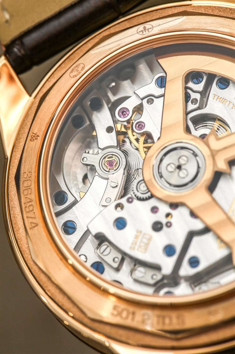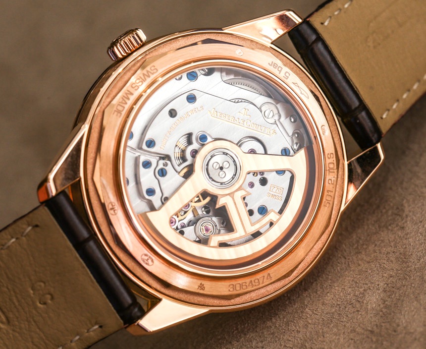 Jaeger-LeCoultre 將他們的新平衡輪稱為“Gyrolab”。新的平衡輪結(jié)構旨在減少金屬,因此比傳統(tǒng)振蕩器更具空氣動力學特性。我碰巧發(fā)現(xiàn)帶有方頭的微型擺輪螺絲特別酷。透過積家 Geophysic True Second 的藍寶石水晶底蓋窗口,您可以看到精鋼和黃金版本腕表均配備純金自動擺陀的機芯。