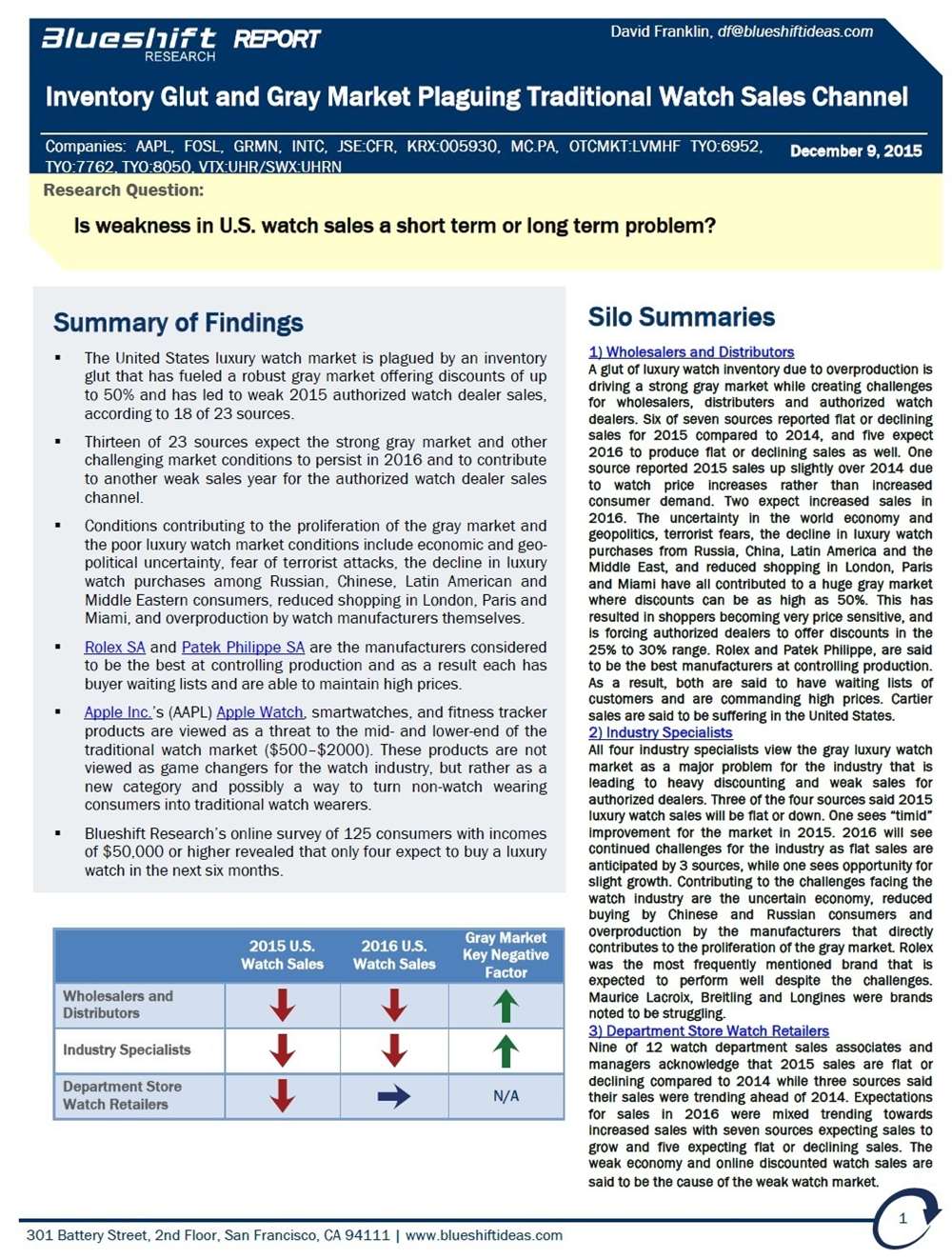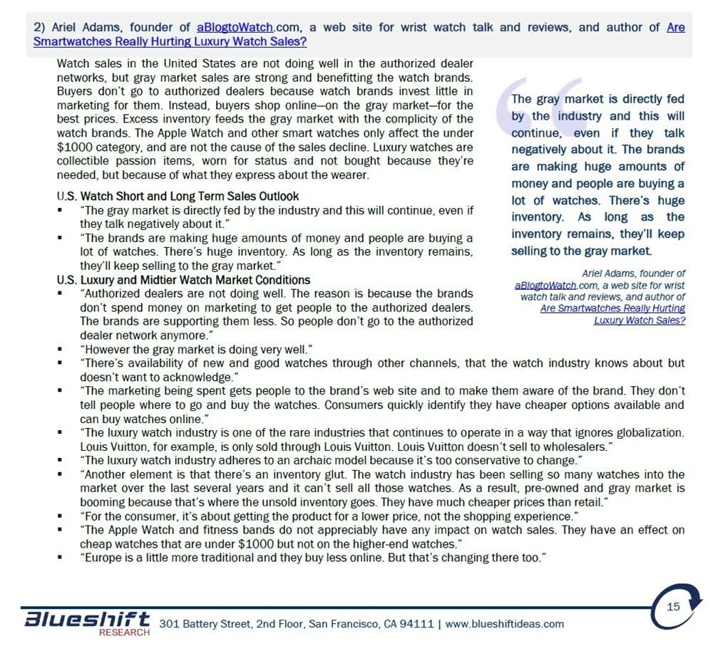 我無法與您分享 Blueshift Research 關于“庫存過剩和灰色市場困擾傳統手表銷售渠道”的完整 44 頁報告,因為這是公司發送給他們的付費客戶的信息,也是他們賺錢的方式(所以分享所有內容這不符合他們的最佳信托利益)。但是,我已經能夠向您展示摘要頁面和我的貢獻所在的部分位置。很高興看到數據和研究支持我對我所服務行業的理論和觀察。了解構成手表市場的極其復雜的生態系統可能會令人沮喪和具有挑戰性。我認為這與鐘表行業的所有領域(從品牌到零售商)以及消費者本身都具有相關性,他們自己必須在這個復雜的舞臺上導航。